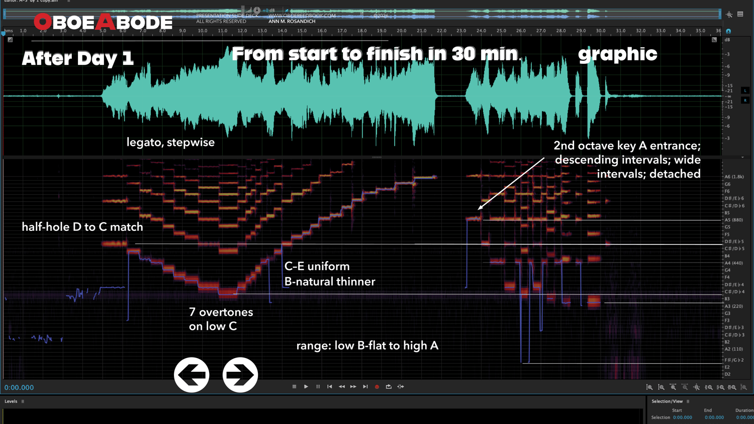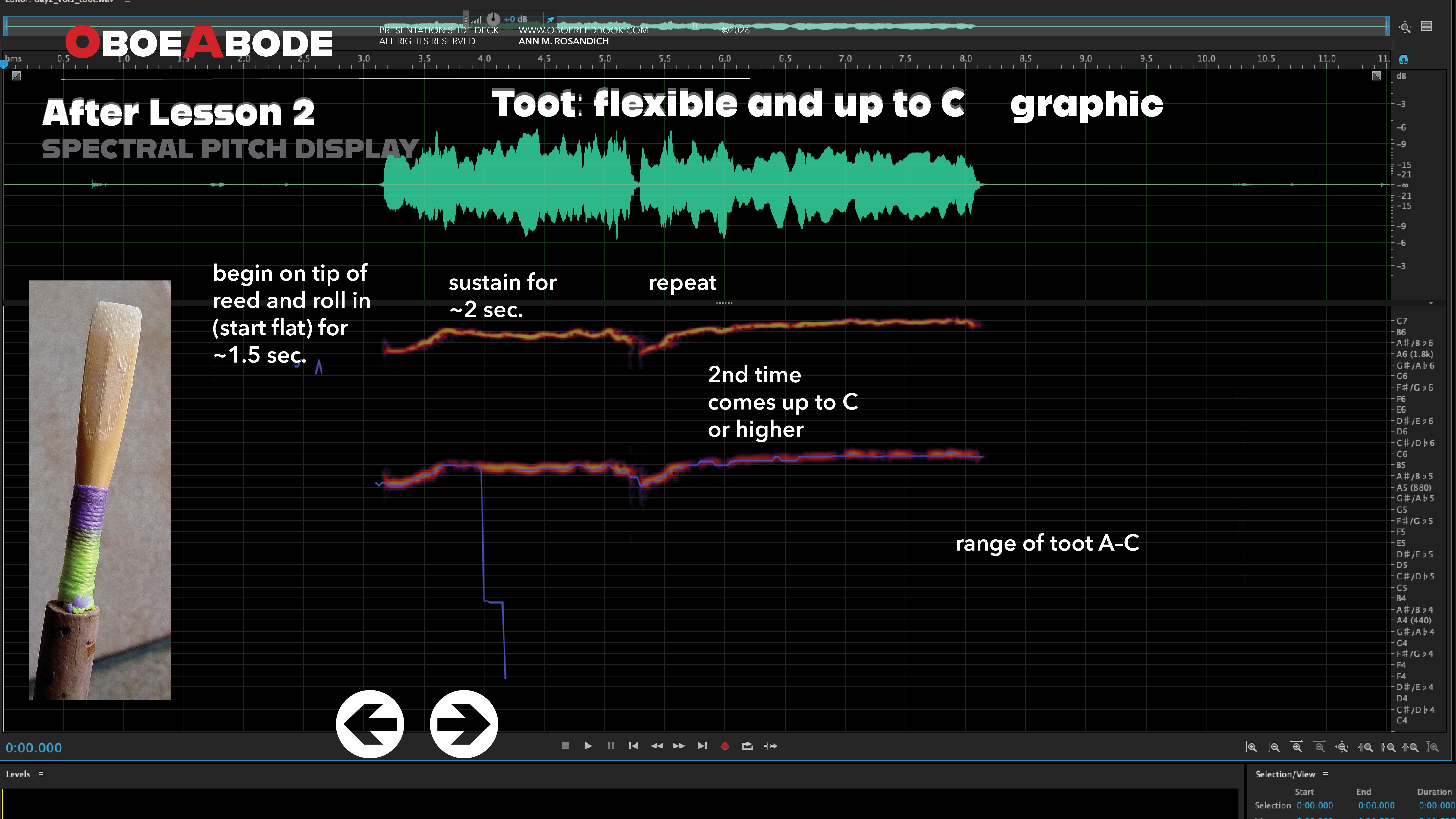 This course expands upon the book with AUDIO and VIDEO that includes demonstrations and audio representations of the 3 basic reedmaking tests and their playability. The course uses the reeds that appear in lessons 2 and 3 and spectral analysis to show the student exactly what kind of sound the reed is producing during the crow, toot, and breath attack, as well as when the reed is played on the oboe at various stages of development.
