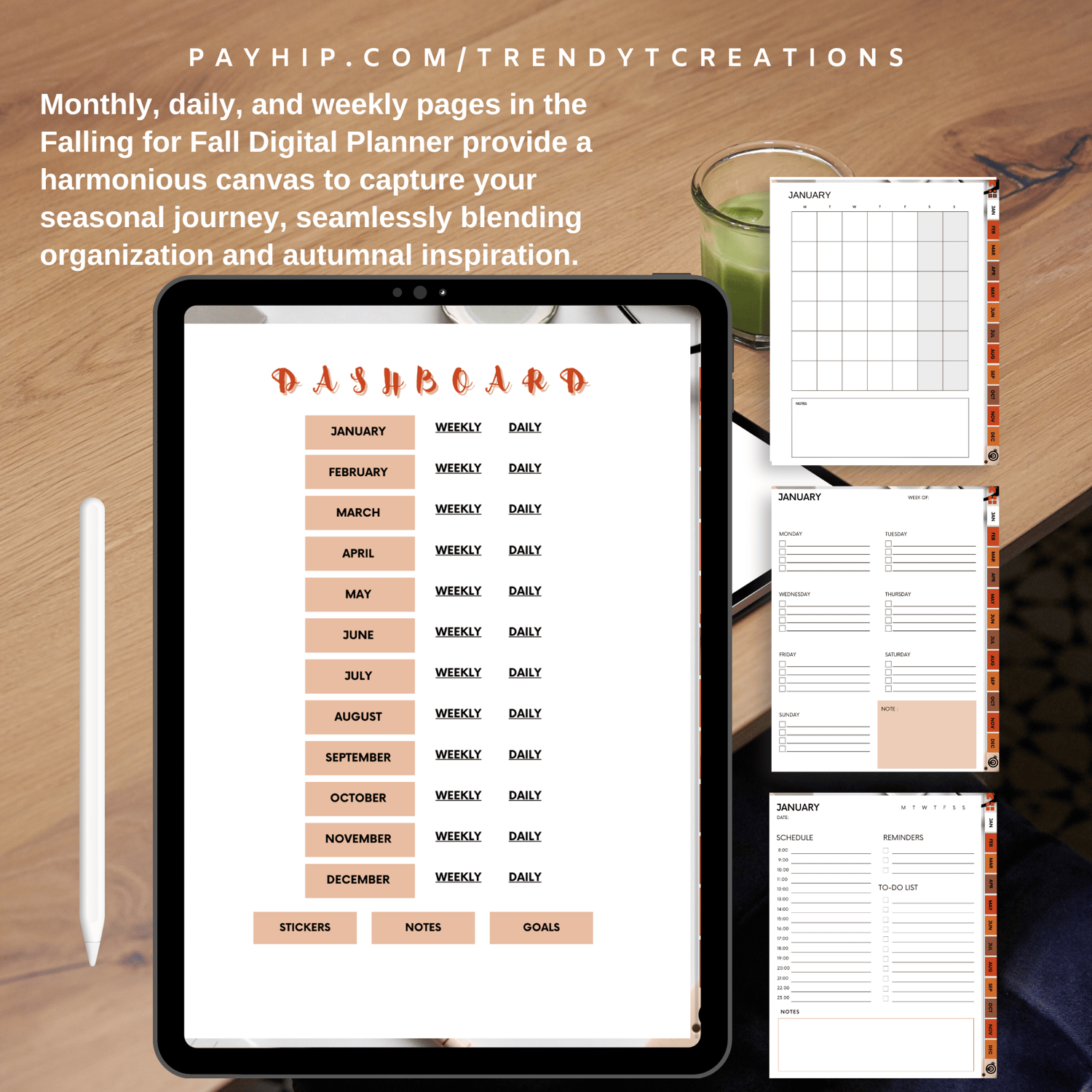 Welcome to the Falling for Fall Digital Planner, your ticket to an autumnal journey of organization and inspiration. Get ready to immerse yourself in the beauty of fall with customizable monthly, daily, and weekly pages that capture the spirit of the season.