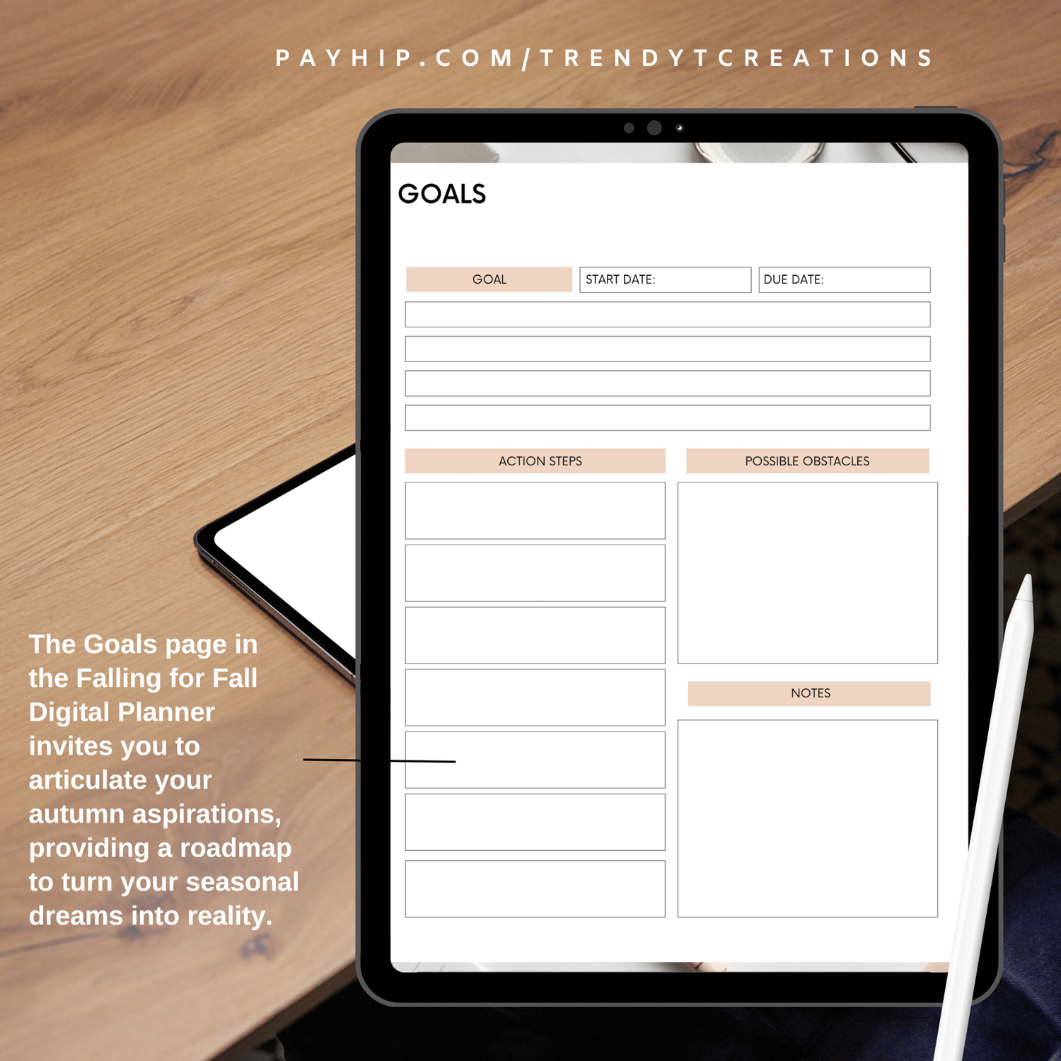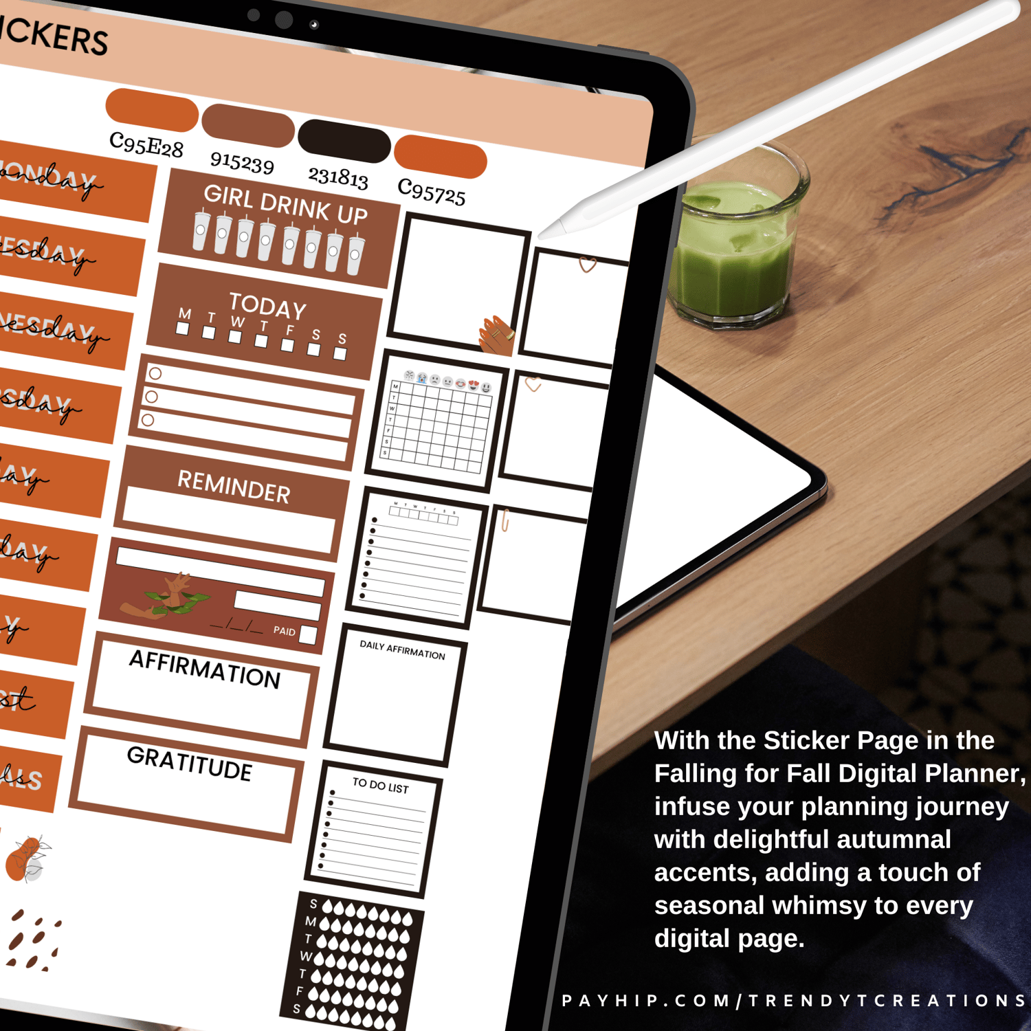 From planning your daily activities to setting ambitious goals and capturing fleeting thoughts in the notes section, this planner adapts to your needs. Elevate your planning experience with the sticker page that lets you infuse your pages with the colors and textures of fall. It's not just a planner; it's a digital canvas for embracing fall's coziness and creativity.