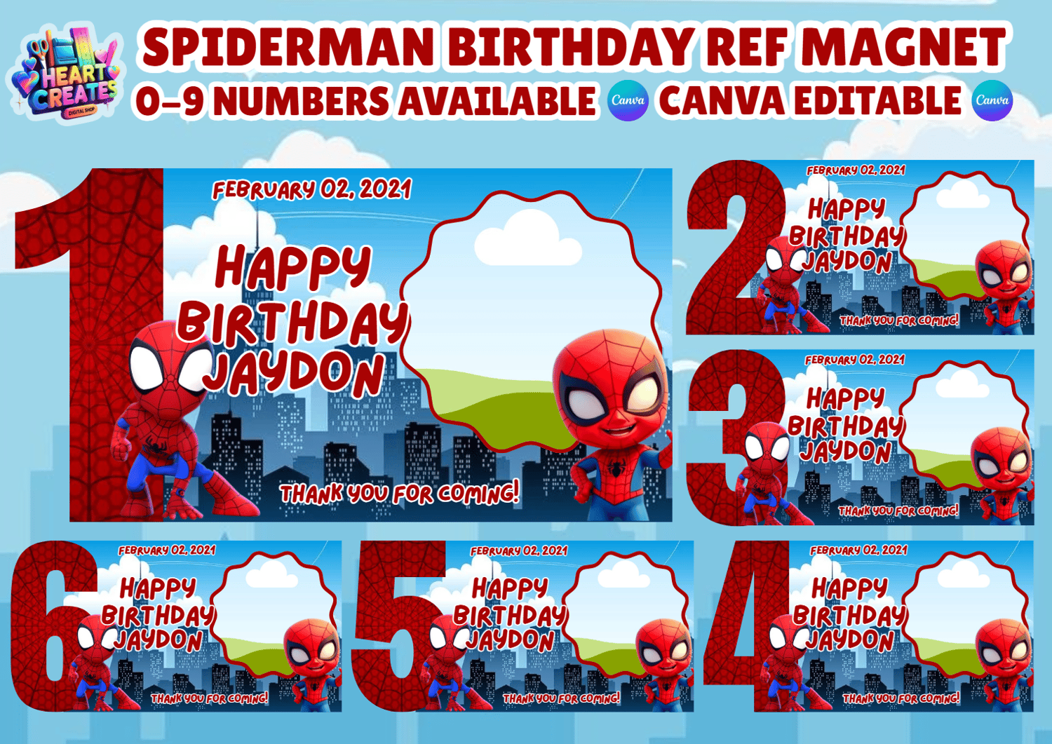 Celebrate your special day with our Spiderman Birthday Ref Magnet! This beautiful digital magnet features a cute Spiderman design and is perfect for birthday parties. It is fully editable using Canva, so you can easily change the name, date, or message to personalize it. The magnet includes numbers from 0 to 9, so you can customize the age to match your birthday boy. Bright, fun, and easy to edit, this Spider Birthday Ref Magnet is a wonderful addition to any birthday celebration!