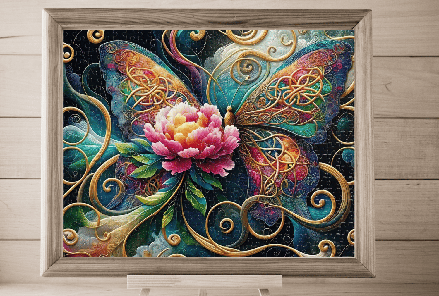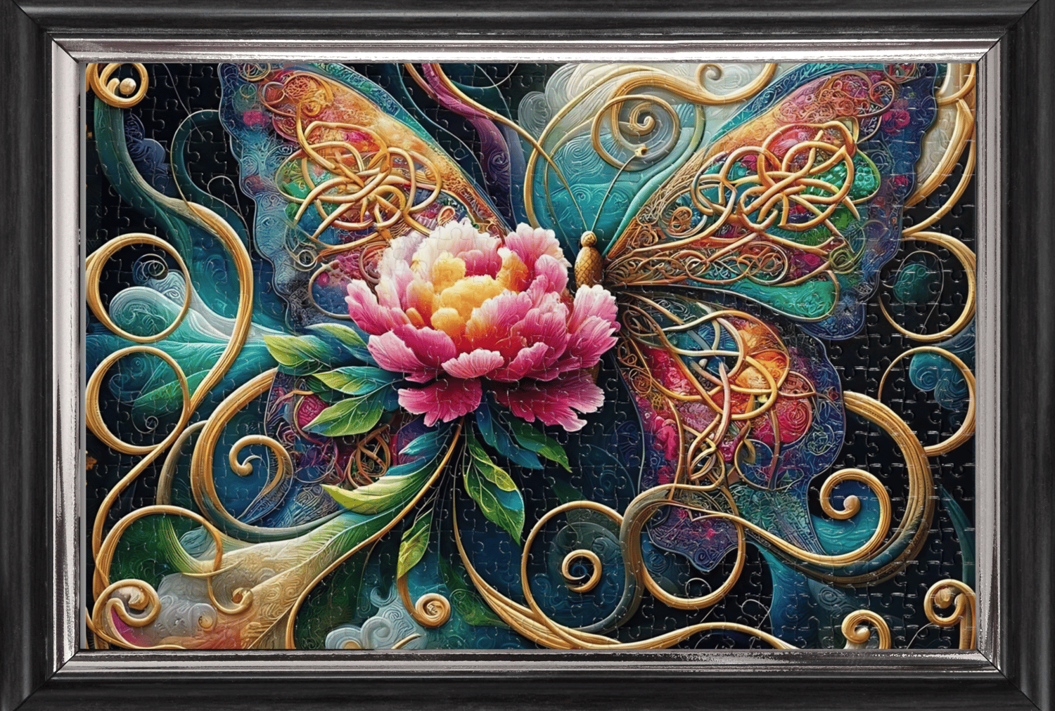 Unveil the mystery of "Enchanted Whorls The Celtic Butterfly Puzzle," a mesmerizing jigsaw that weaves the magic of Celtic knots with the natural splendor of a butterfly garden. Choose your own adventure with a 1000-piece challenge that will captivate your imagination for hours, or opt for the 500-piece version for a bewitching but breezier puzzle experience. The centerpiece is a resplendent peony, its petals bursting with life, embraced by the wings of a majestic butterfly adorned with intricate Celtic patterns, glowing as if lit by the first light of dawn. The elaborate knotwork and swirling accents that frame this natural beauty draw you into a labyrinth of serene contemplation. Assembling this puzzle piece by piece is like wandering through a mythical garden, where every turn reveals a new secret waiting to be discovered and every piece placed beckons you further into a world of wonder and tranquility.