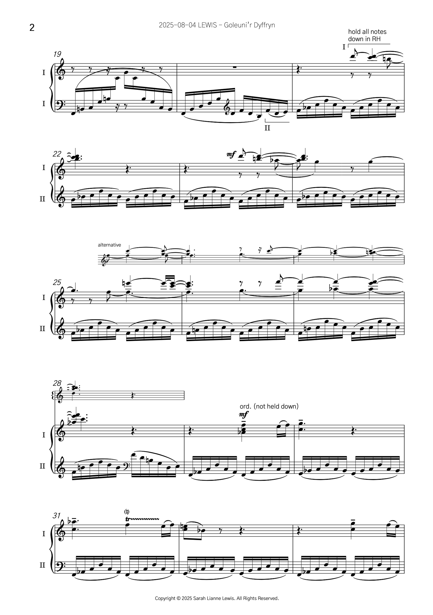 ‘Goleuni’r Dyffryn’ is inspired by the well-known Welsh folk song ‘Dafydd y Garreg Wen’ (‘David of the White Rock’). Legend is that the song was composed by Welsh harpist David Owen (1711-1741) whilst on his deathbed. The melody has since been passed through generations of musicians and composers, each interpreting it in their own way over the years, with accompanying words added more than a hundred years later by John Ceiriog Hughes (1832-1887).In ‘Goleuni’r Dyffryn’, fragments of the original folk melody surface and vanish like echoes across a valley, while Baroque-influenced dance rhythms and contrapuntal textures are reflective of the harpsichord’s golden age. The result is part neoclassical, part folk in spirit; a nod to the canon of existing harpsichord music, whilst offering something new.