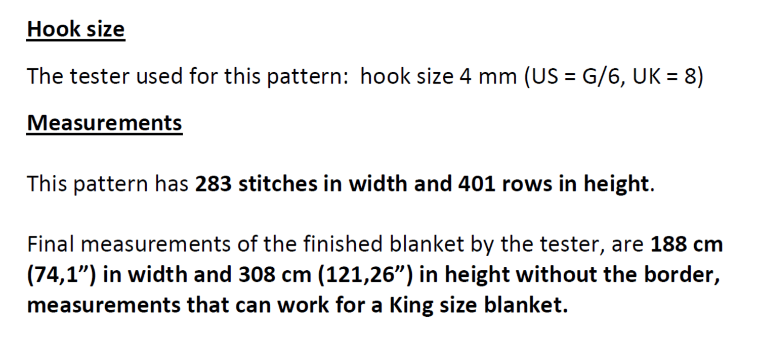 For this pattern, I´ve used a 4 mm hook (US = G/6, UK = 8) and the measurements with the recommended yarn (Unico by Stop yarns) were 188 cm (74,1”) in width and 308 cm (121,26”) in height without the border, measurements that can work for a King-size blanket.