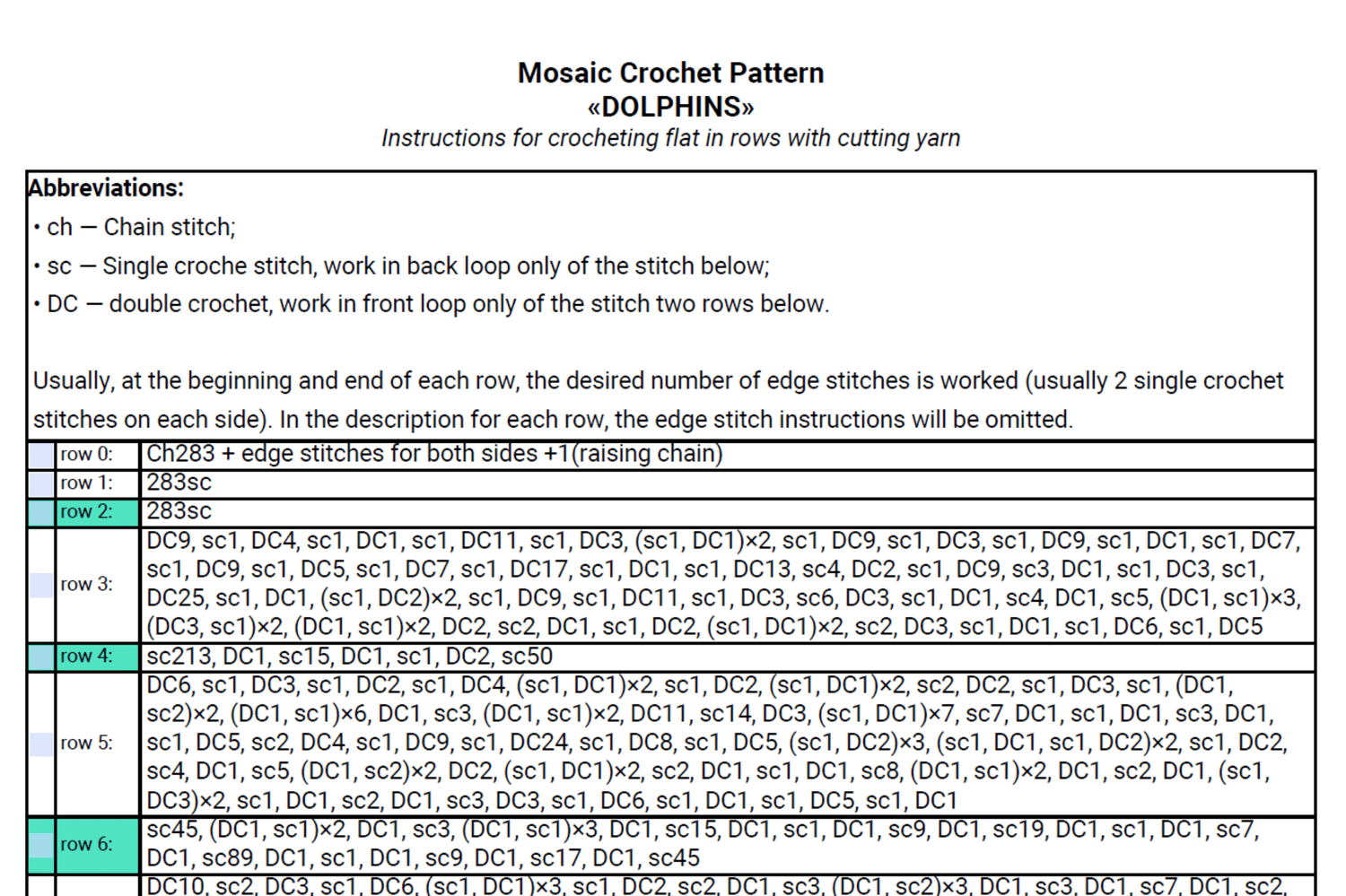 - Written pattern, row by row in PDF
