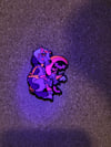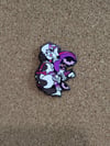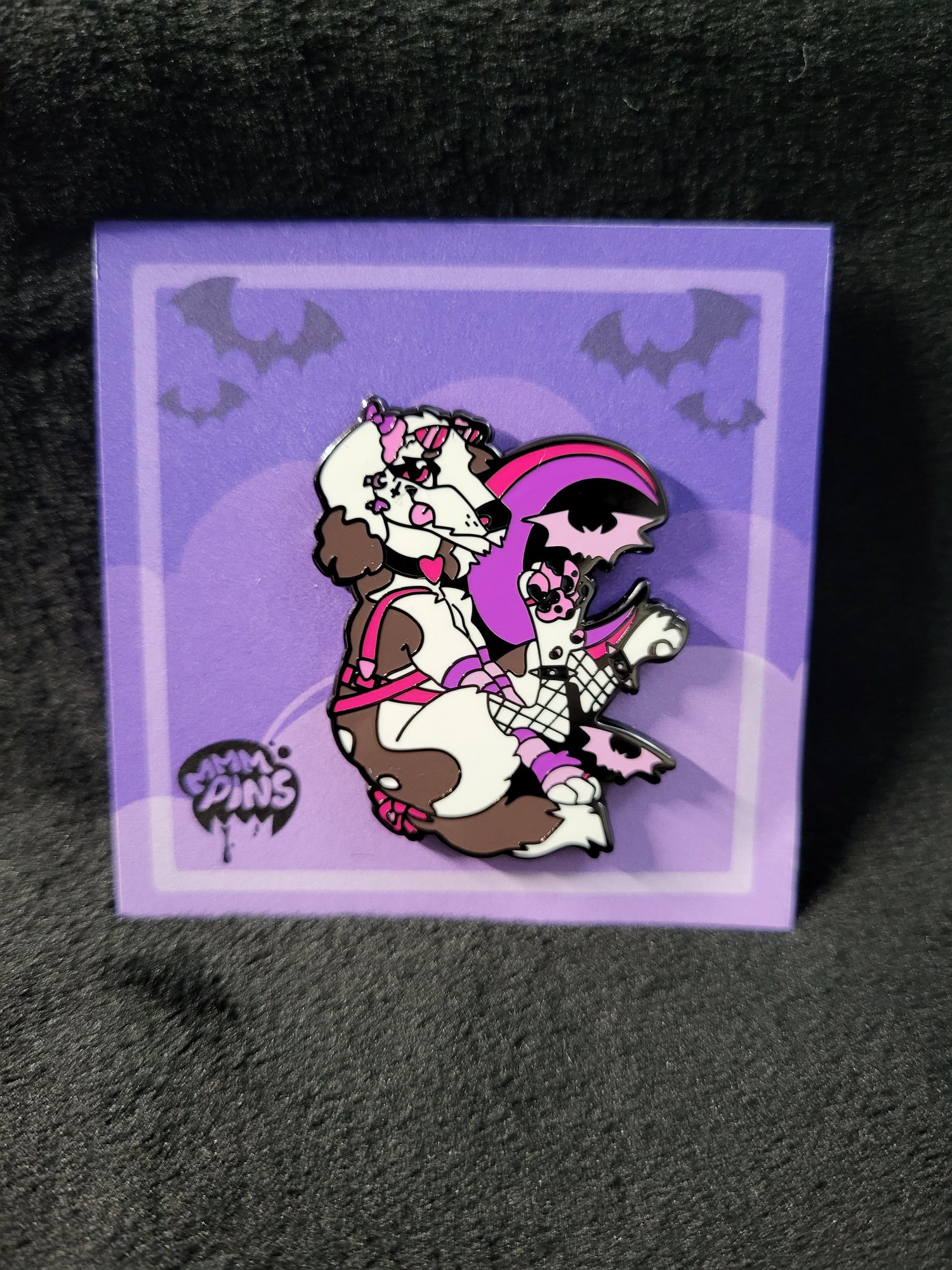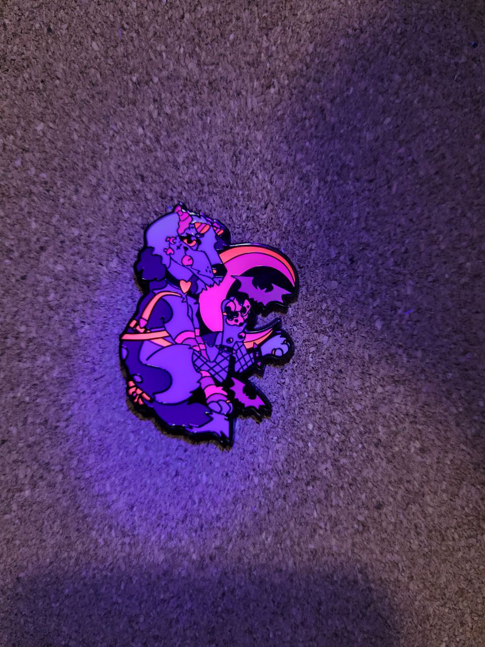 A 1.5" Enamel pin designed by MMM Pins! This design is of a pastel goth party poodle based off my service animal! She has UV reactive colors and 2 back posts featuring the designers logo on the back! Tack a peek at the back of your card as you may qualify for a prize!