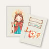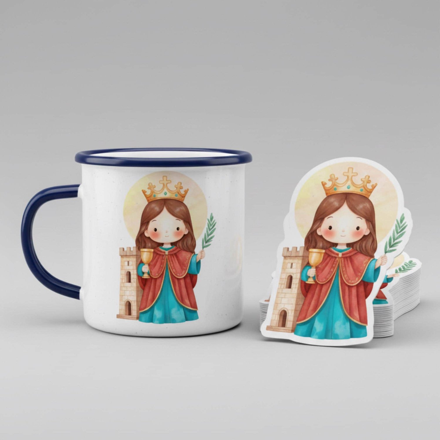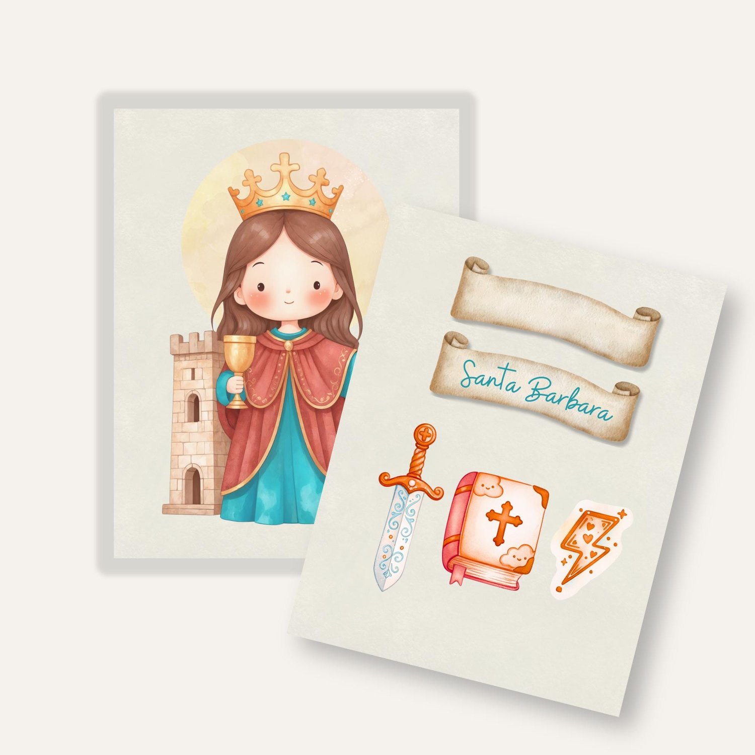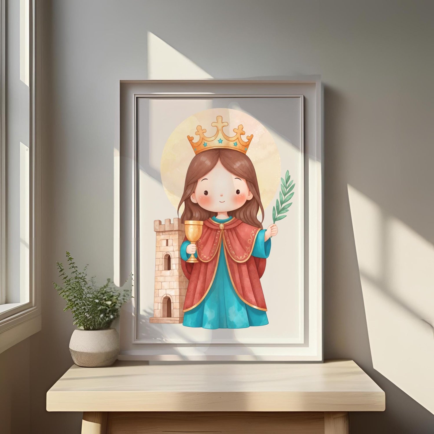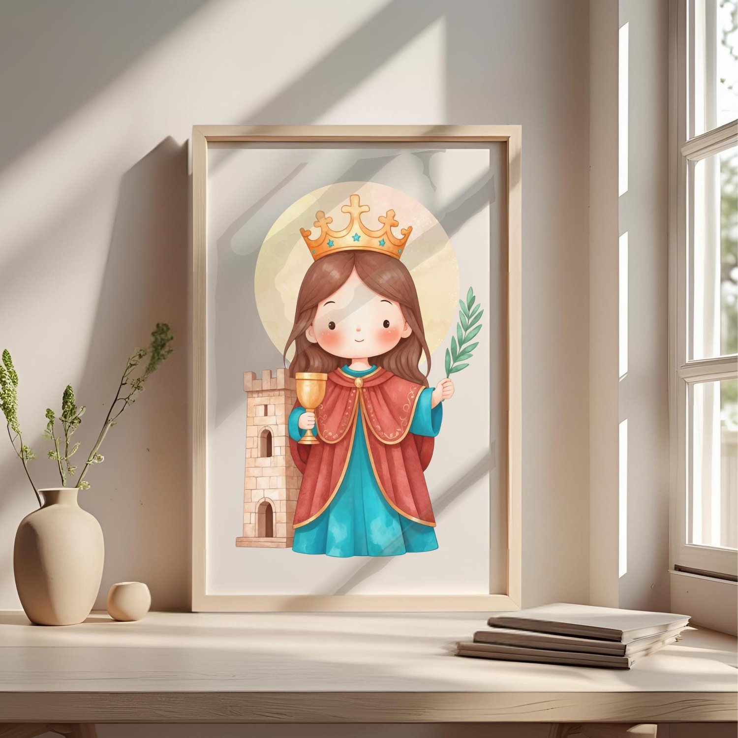 Honra la valentía y la fe de Santa Bárbara con esta hermosa y tierna ilustración digital. Perfecta para quienes buscan un toque devocional, moderno y dulce para sus proyectos. Santa Bárbara, Patrona contra el rayo y las tormentas, es la adición ideal para tus creaciones religiosas.