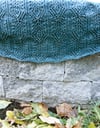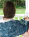 Rakuyou (pronounced rak-oo-YO) is a Japanese word meaning fallen or shedded leaves. The Rakuyou Shawlette is a wide, shallow piece which is highly textured with Japanese lace and twisted stitches. Working from the top down with increases at each end of every right side row keeps the lace design uninterrupted. The final piece has almost a mustache shape, so the center back can be worn flat or folded as a mini collar at the nape of the neck. The shawlette uses less than 400 yd (366 m) of yarn, making it perfect for one special skein.The yarn shown in the sample is Zen Yarn Garden Serenity Glitter Sock, colorway “Teak.”
