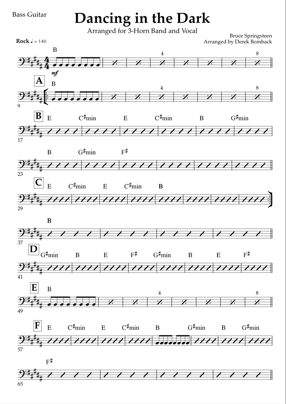 Dancing in the Dark by Bruce Springsteen. Key of B major. Arranged for 3 horn band and vocal (Trumpet, Tenor Sax, Trombone, Guitar, Piano, Bass Guitar, Drums & Lyric Sheet).
