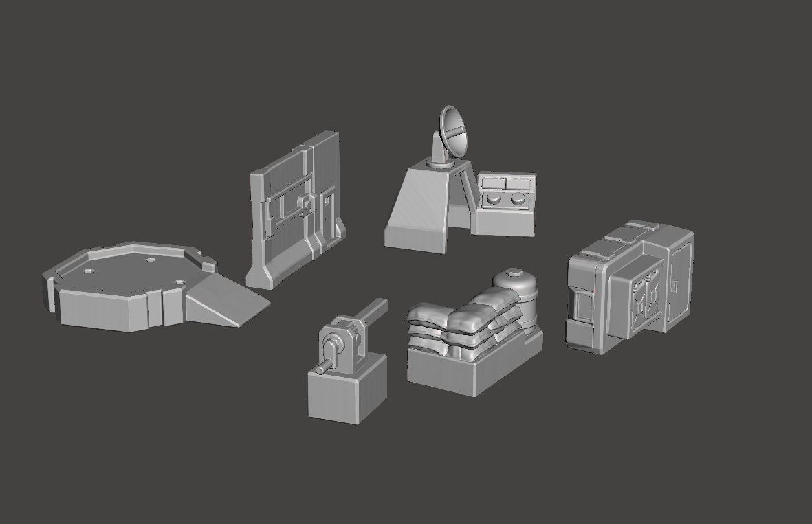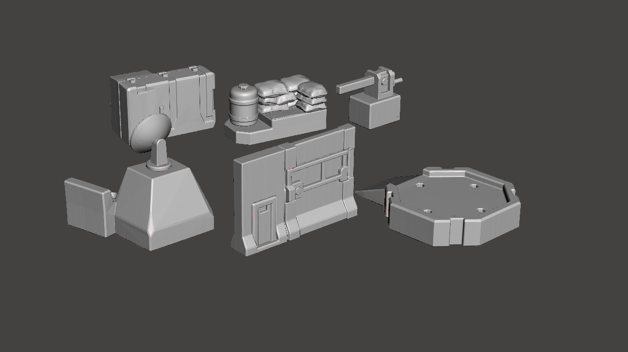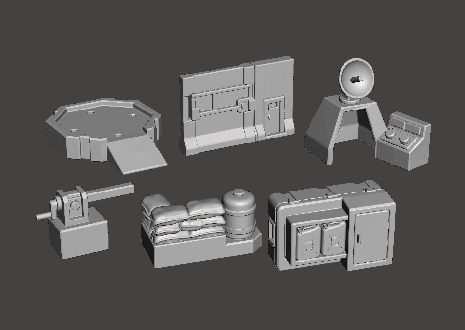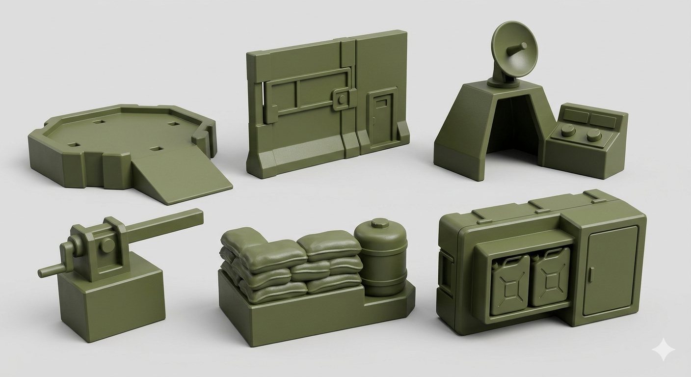 This kit includes a variety of modular outpost and battlefield accessories such as a turret, command station, barricade, platform, supply storage, and defensive elements. Designed with clean, durable shapes for easy 3D printing and fast assembly.