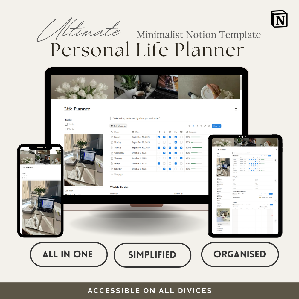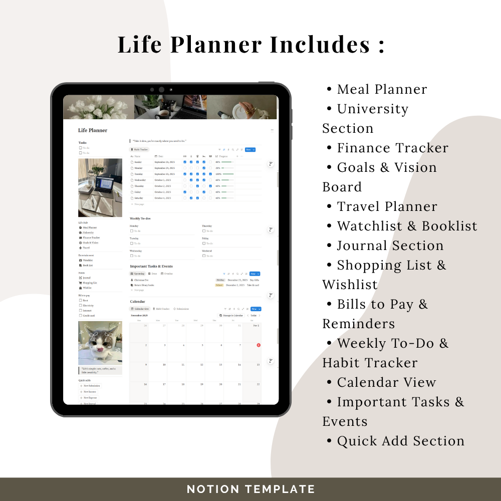 This all-in-one Personal Dashboard helps you manage every part of your life in one place. Stay on track with a habit tracker, weekly to-dos, calendar view, and important dates. Organize your studies with a university hub, plan meals, and keep your finances and bills in check. Capture your goals & vision, travel dreams, booklist, watchlist, journal entries, shopping list, and wishlist — everything you need to stay balanced, productive, and inspired.