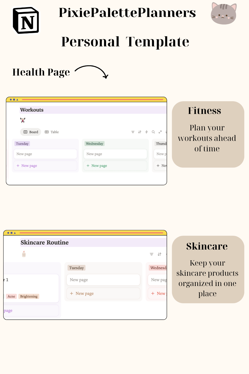 - Log workouts, track medications/supplements, and skincare routine in the Health Page