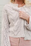 Lyrebird is a romantic cardigan with dropped shoulders, comfy crew neck, double layered collar, double knitted plackets and straight sleeves that provides bell-like look around wrists. The cardigan is fully made with intricate lace patterns and the collar and the hem are finished with Rib 1×1. It is worked top-down and completely seamless.