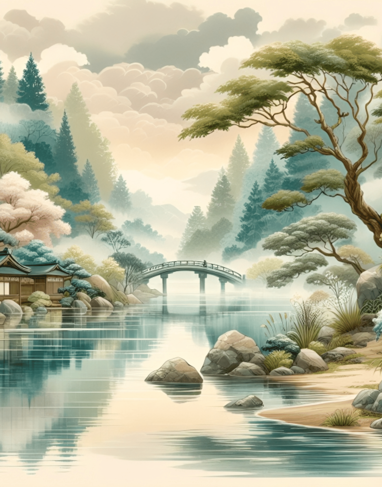 Japanese Painting, River Bridge, Mountain, Vintage Village, Top Art, Nostalgic Rural life, Nature, Cool Nature, Beautiful Nature, Sunrise, Natural Landscape, Wall Art, Digital Art.