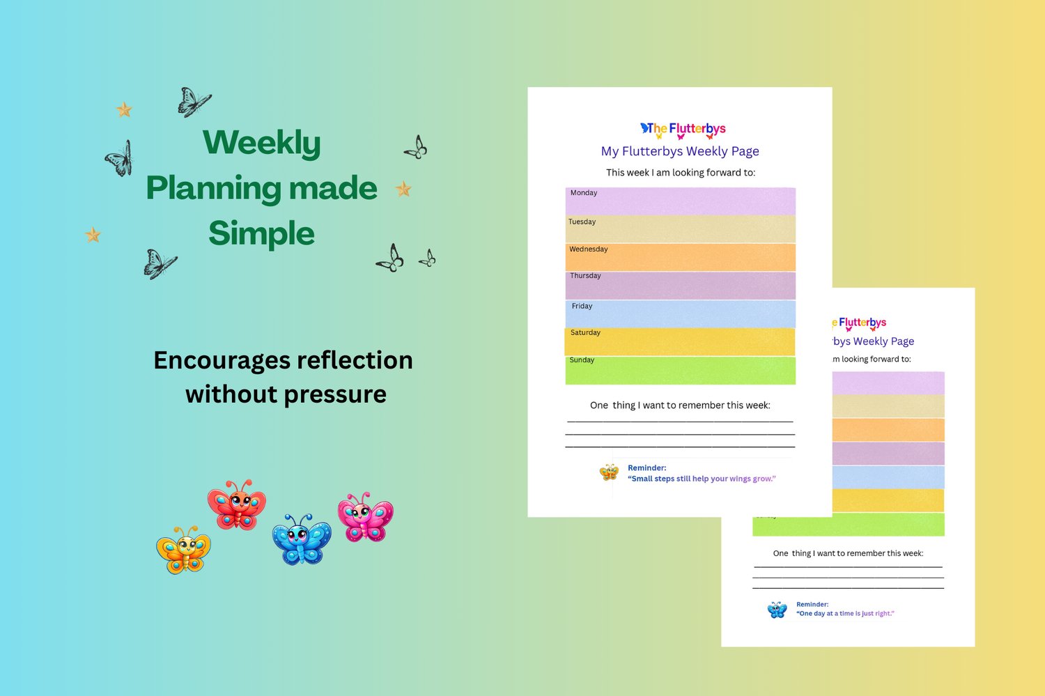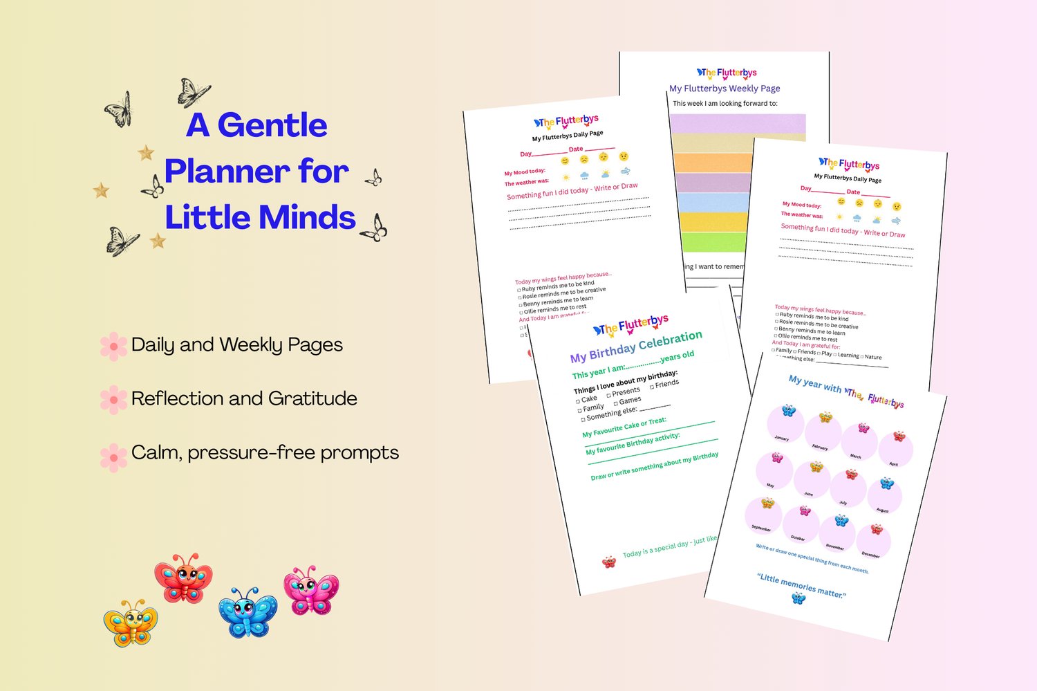 The Flutterbys Children’s Planner is a calm, pressure-free printable planner designed to help young children reflect, express feelings, and notice the little moments that matter — in their own way and at their own pace.