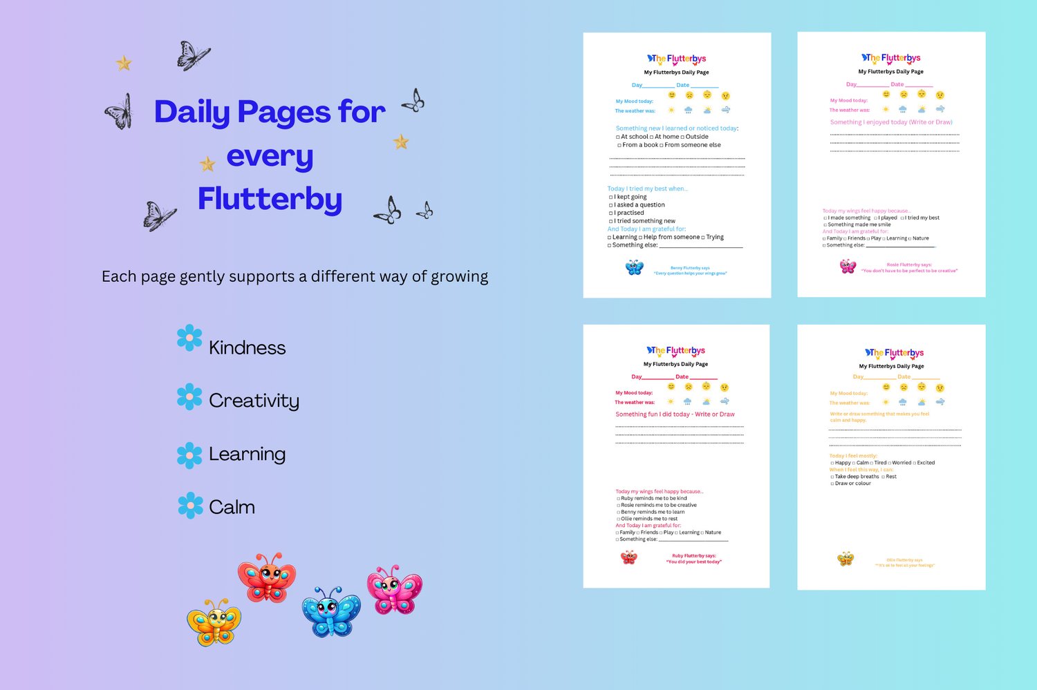 ✔ 4 Daily Pages (one for each Flutterby theme: Kindness, Creativity, Learning & Calm)