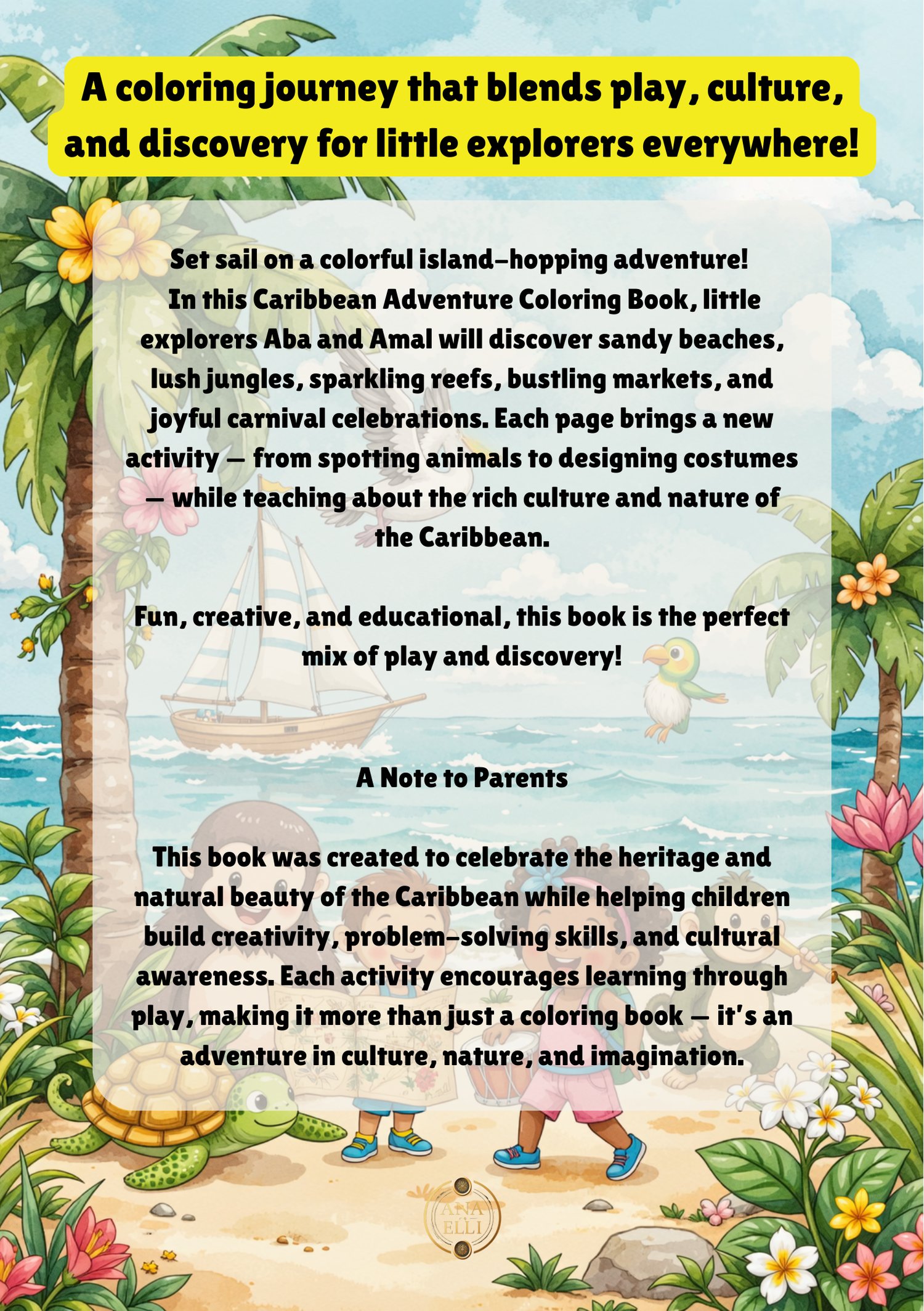 The Caribbean Adventure Coloring Book takes little explorers Aba and Amal on a magical trip through sandy beaches, lush jungles, sparkling coral reefs, bustling markets, and joyful carnival celebrations.