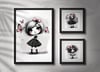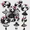 Girls in polka dot dresses. Black and white with pink bow and butterfly. 7 girls, with and without background. 14 PNGs. Sublimation, DTF etc.. Ideal for greeting cards, mugs, clothing etc. add your own text to customise.