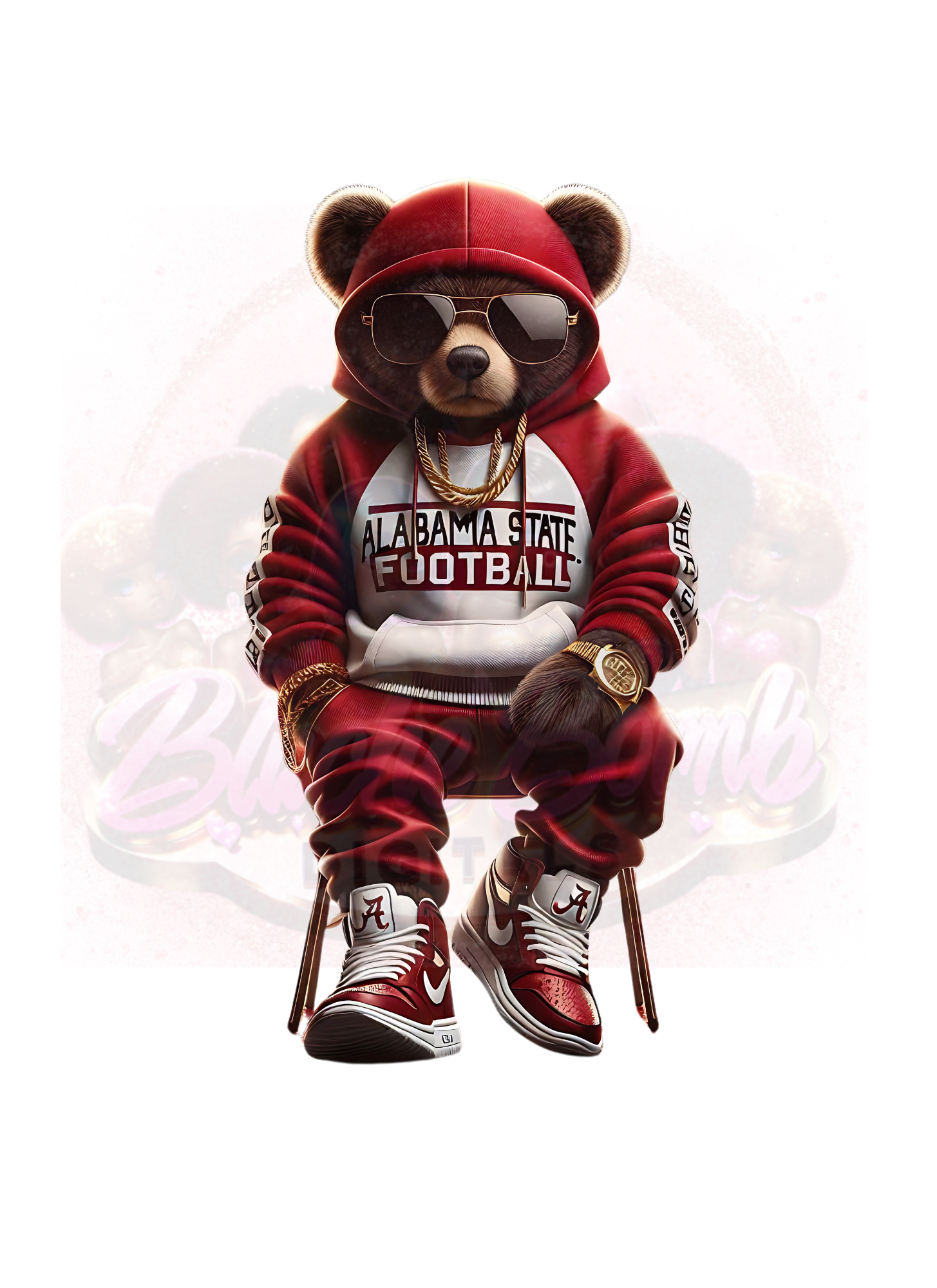 Bring team pride to life with this bold Alabama State Football teddy bear digital design! Featuring a trendy teddy in a red hoodie with gold accessories and sneakers, this design is perfect for crafting T-shirts, mugs, wall art, or personalized gifts for fans and alumni. Whether it’s for game days, tailgates, or everyday wear, this unique graphic will stand out!