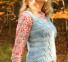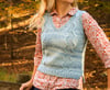 Vilcanota incorporates simple cables into a classic sweater vest shape with modern details. Slightly cropped in the front, it hangs lower in the back thanks to a split hem. Cables frame swathes of stockinette and reverse stockinette forming contrasting “rivers” on the front and back. A deep v-neck and moderate waist shaping create a feminine silhouette.