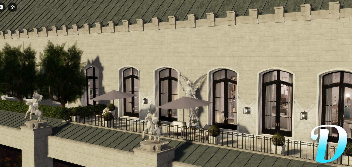 - Expansive balcony area with seating, plants, and statues