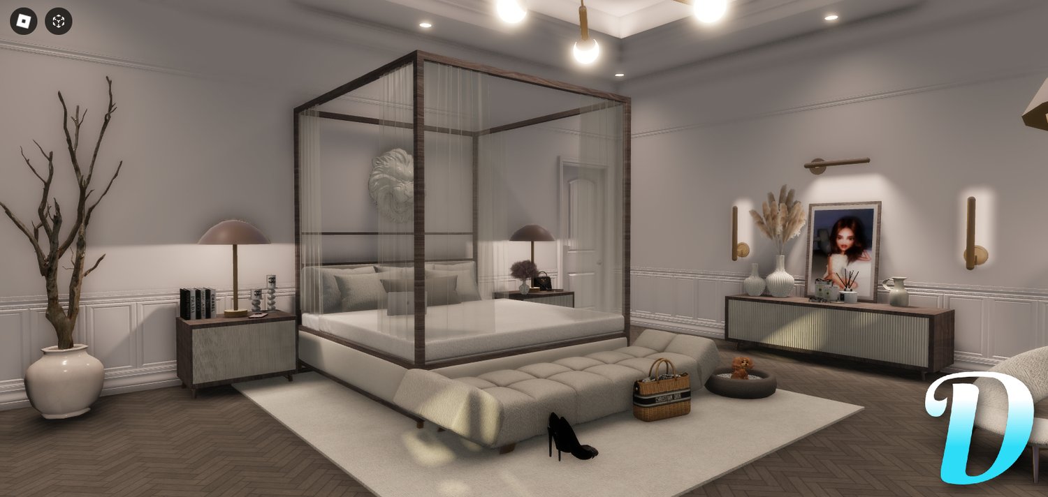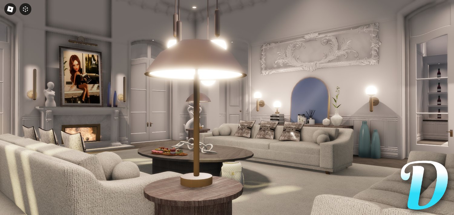 - Cozy interior style with predominantly white decor, luxurious decorations, statues, and high-end brand items such as Christian Dior and Chanel