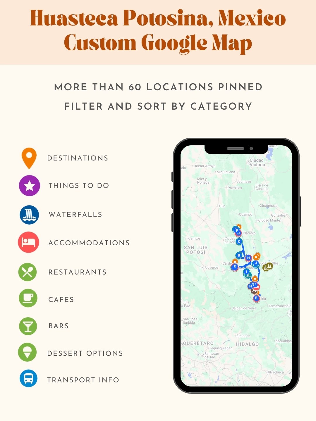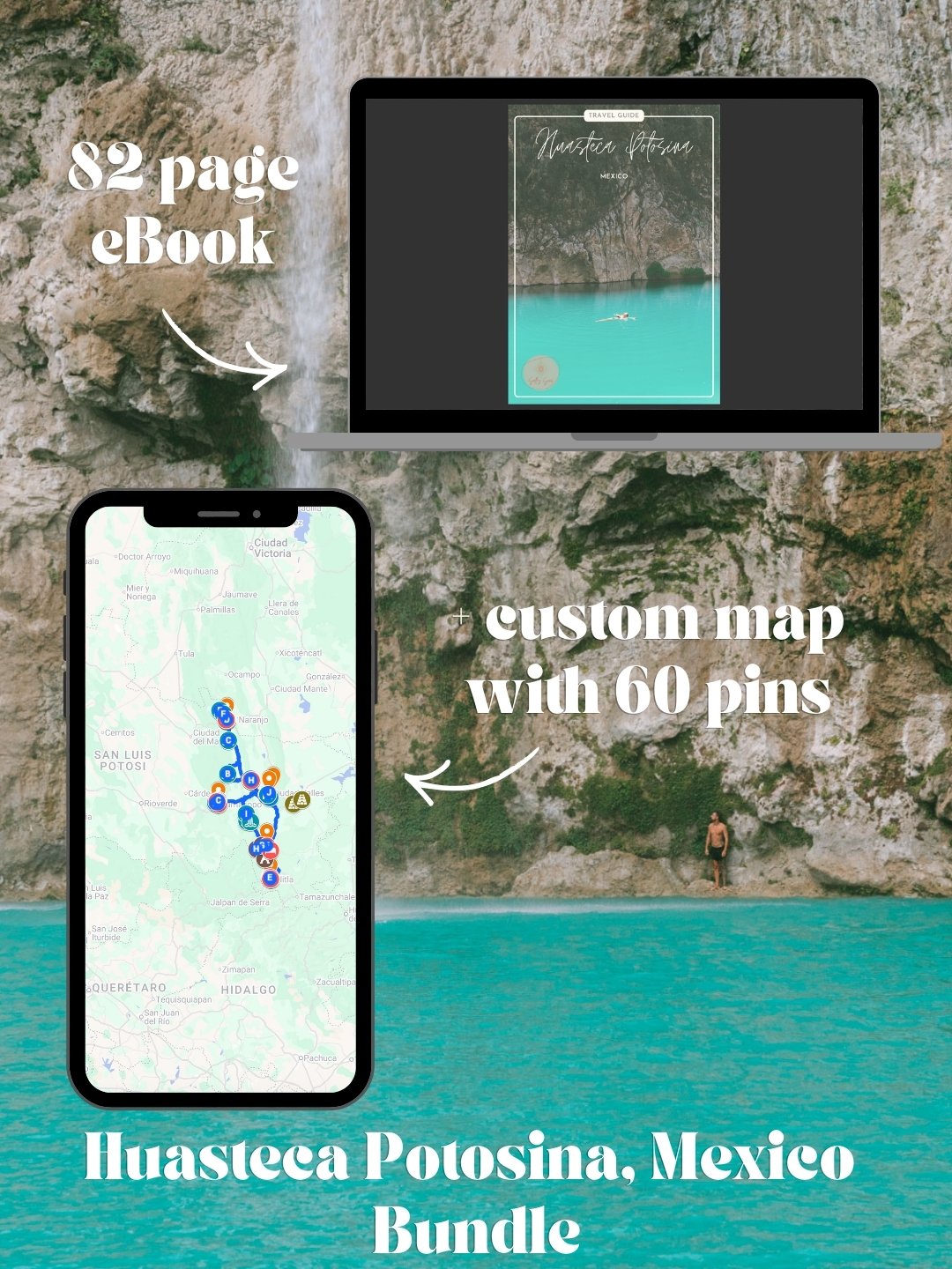Plan the perfect adventure in Huasteca Potosina with our bundle, including our 82-page travel guide eBook plus our custom map with over 60 pins.