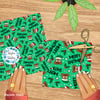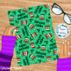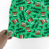 Sarcastic poop emojis wearing Santa hats on green.