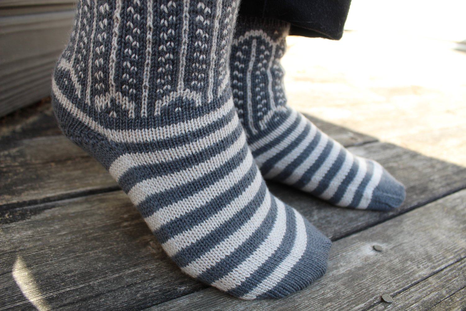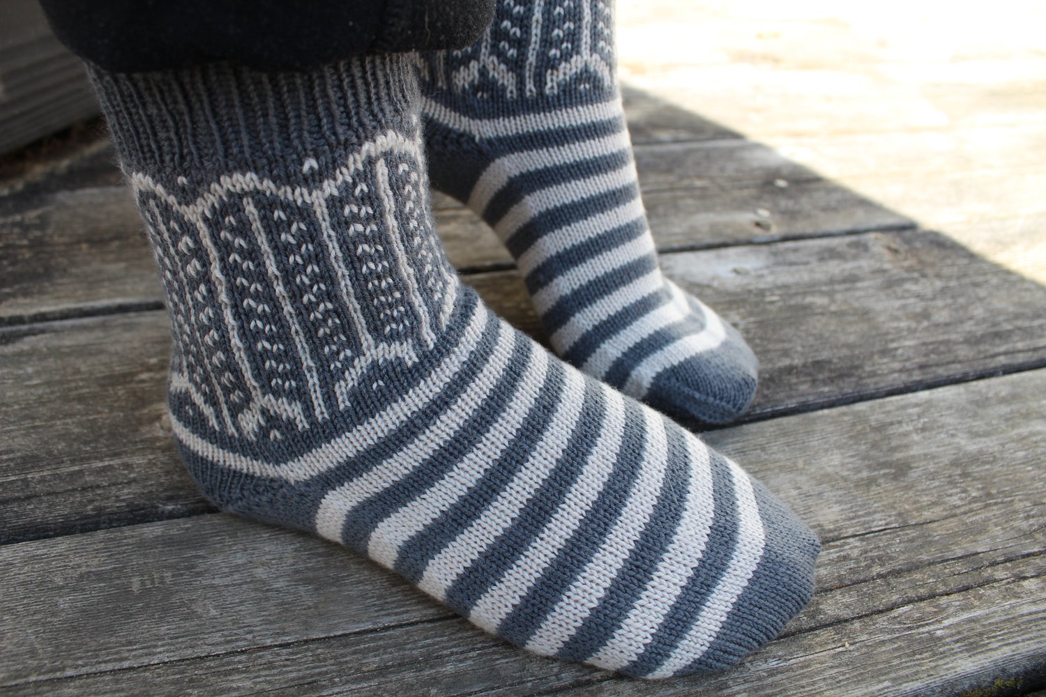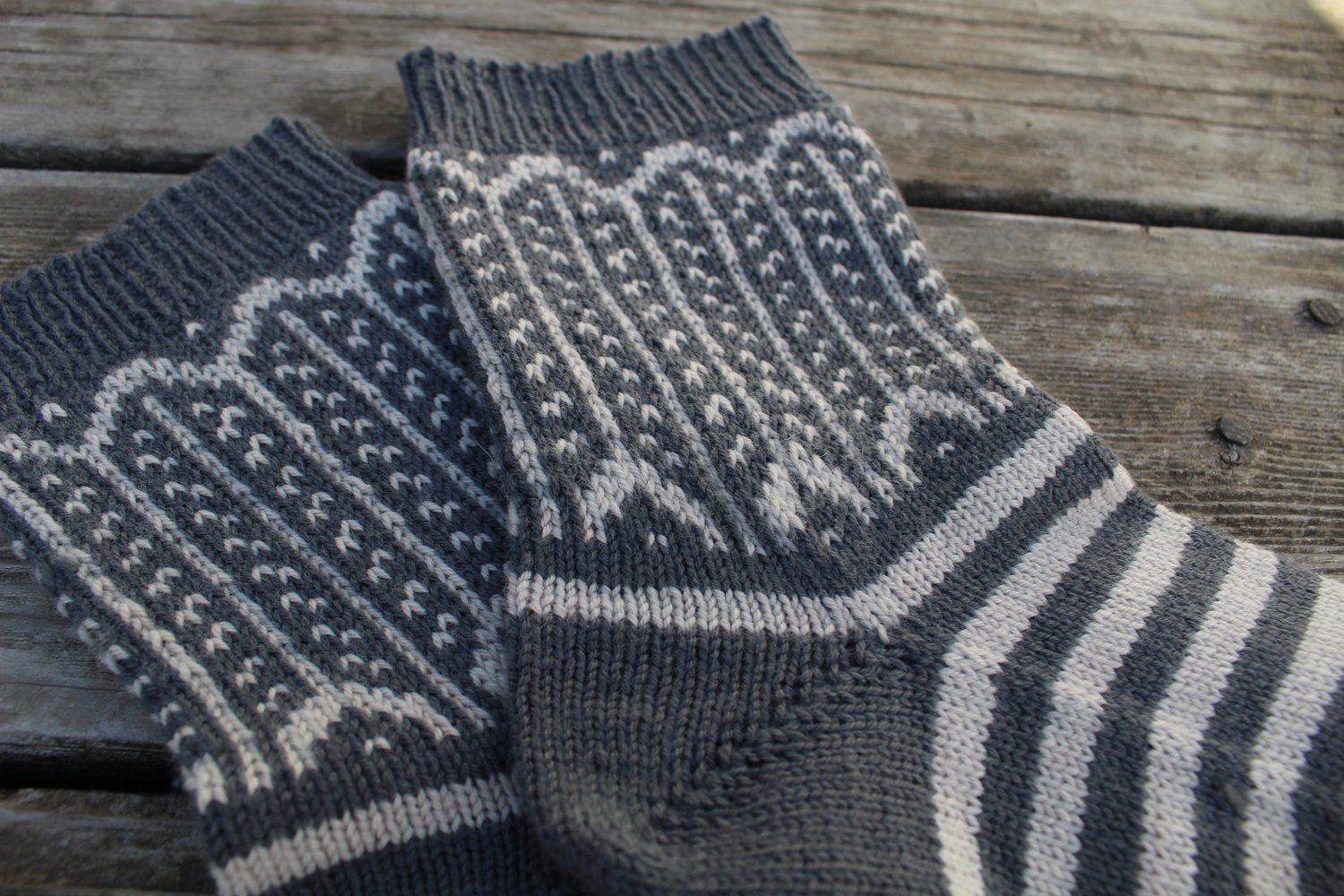 Numida Socks were designed with an adorable feather motif inspired by the beautiful, helpful, and comical Guinea Fowl. They are knit top down, using stranded colorwork to create the lovely feathers on the legs. The pattern is written using a 9” / 23 cm circular needle for everything but the toe (which requires either magic loop or DPNs) but the pattern construction is easily converted to whatever small circumference knitting method you prefer.