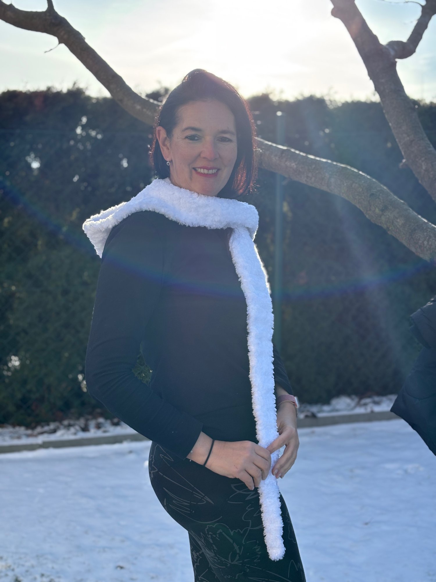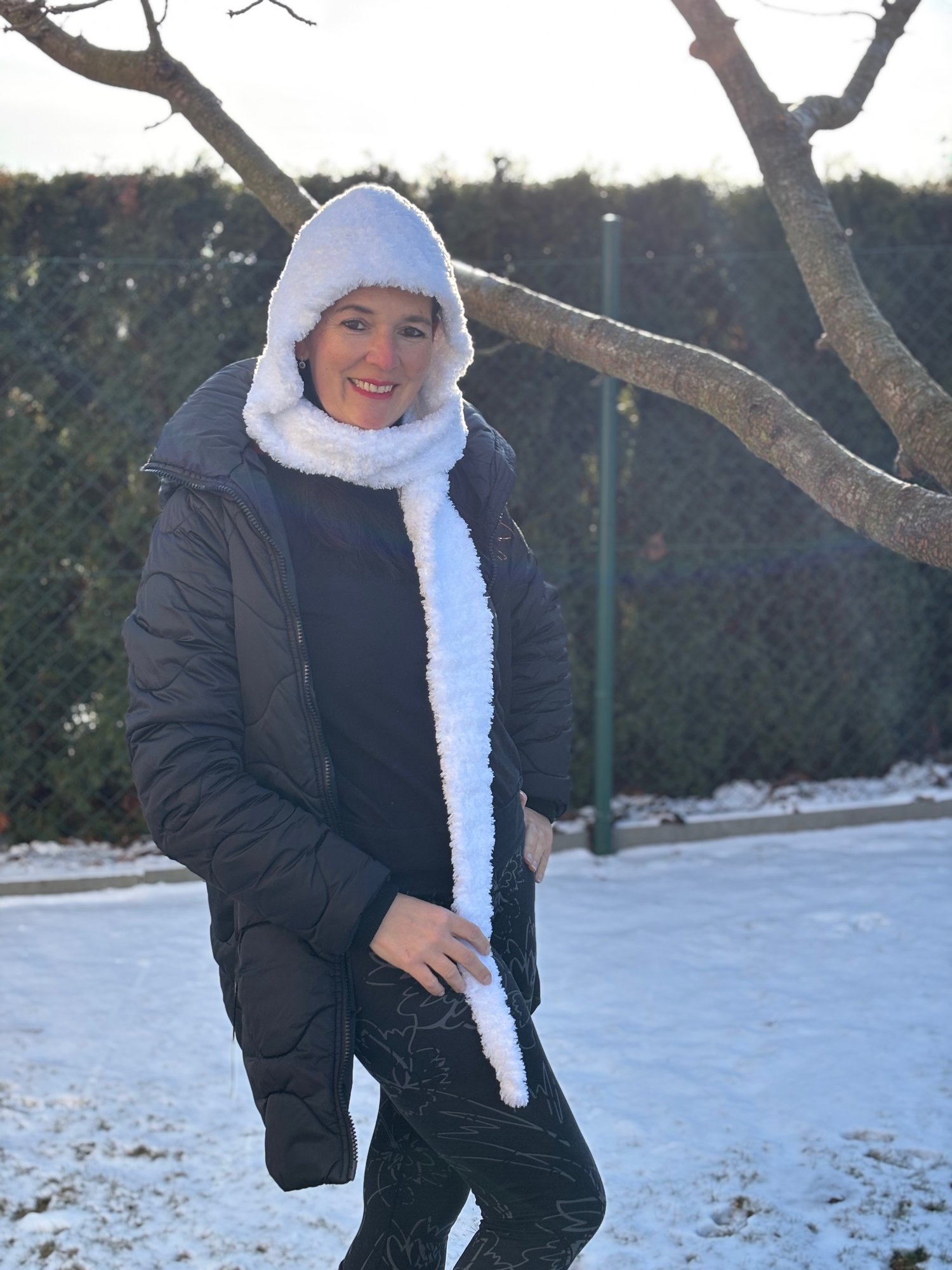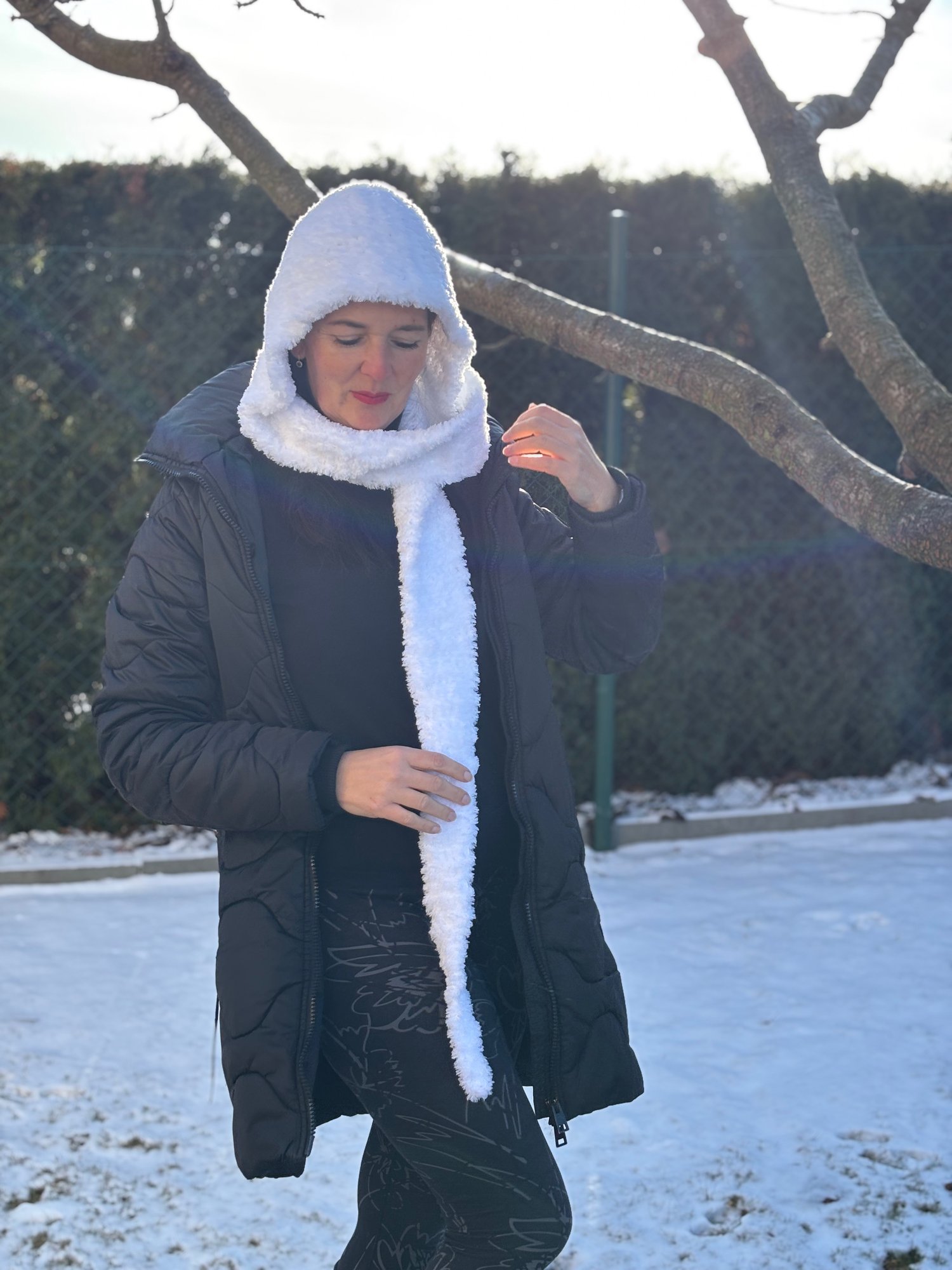 Tento šál je navržen s důrazem na maximální praktičnost – když přituhne, jednoduše nasadíš kapuci a jsi v teple. Jakmile vysvitne sluníčko, kapuci jen shodíš a necháš ji ležérně zdobit ramena jako elegantní doplněk. Háčkovala jsem z efektní žinilkové příze Polar, která je neuvěřitelně hebká, moderní a dodá celému modelu ten správný šmrnc.