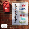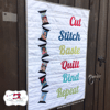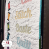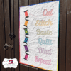 This super cute mini quilt finishes up at about 22x32 inches and will cheer up your crafty space! It features a stack of spool blocks on the left that appear to be tumbling down. To the right are words relating to quilting: Cut; Stitch; Baste; Quilt; Bind; & Repeat.
