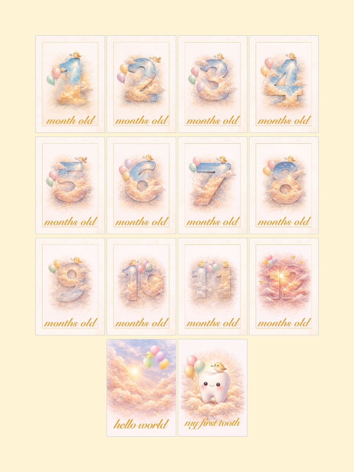 Cloud Nine Monthly Milestone Cards — 14 Printable Baby Photo Cards | Hello World, Months 1–12, First Tooth | 5×7 Printable PDF