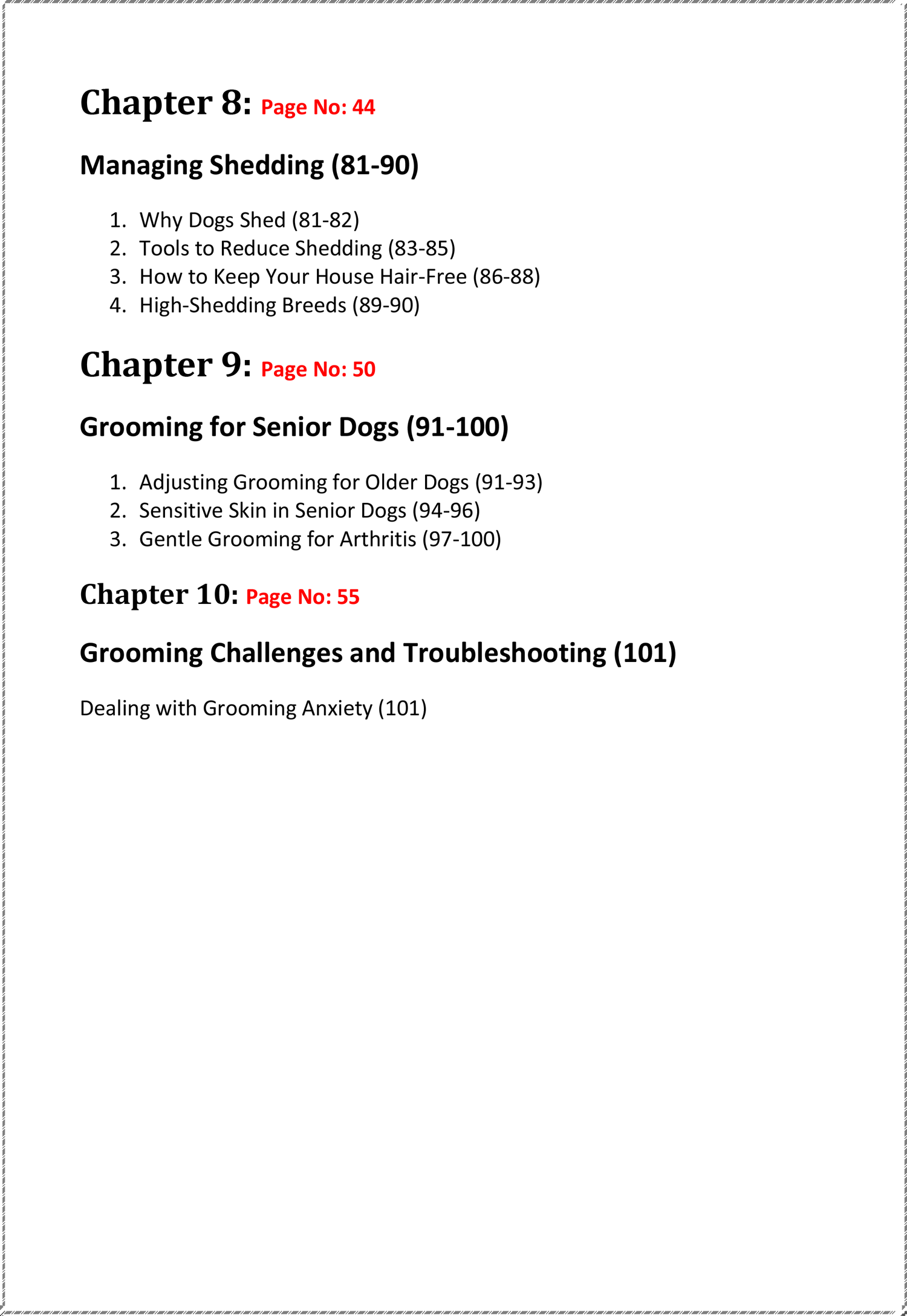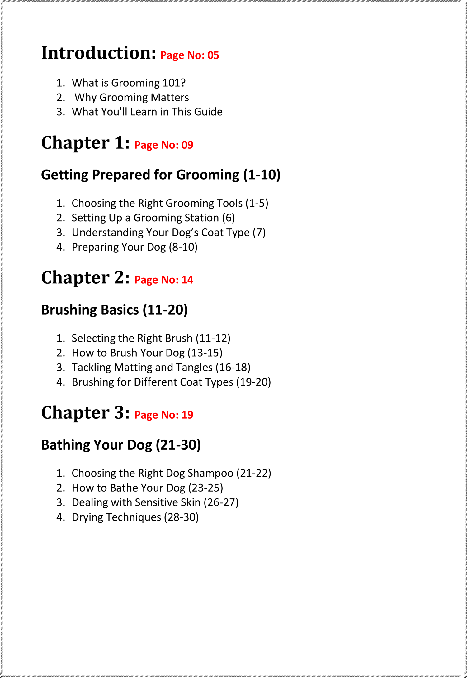 This eBook features 11 detailed chapters with expert insights, offering you a step-by-step roadmap to mastering dog grooming—covering everything from brushing and bathing to breed-specific grooming, nail care, managing shedding, and handling grooming challenges for a fabulous, well-groomed dog, no matter the breed.