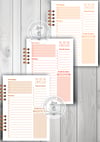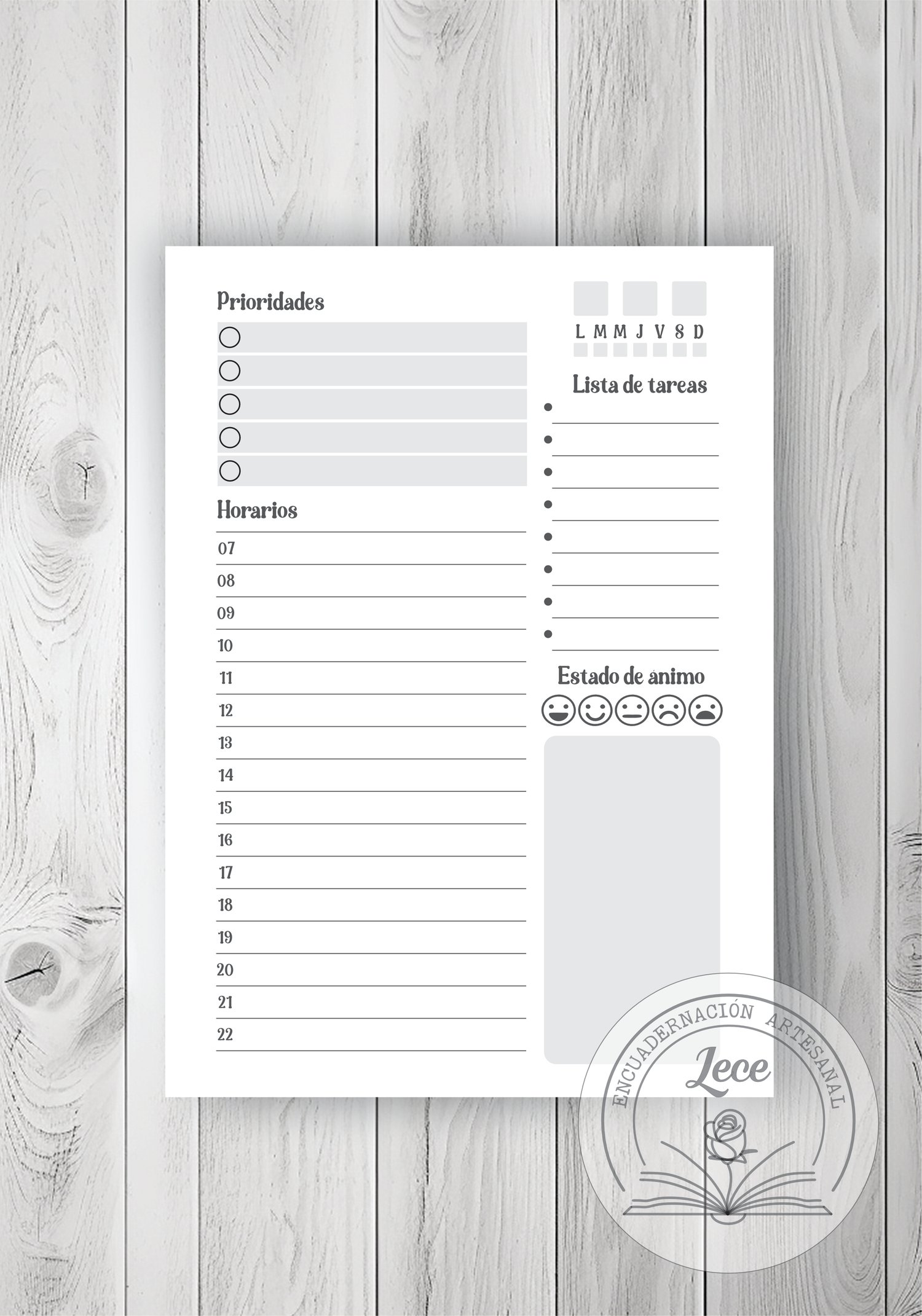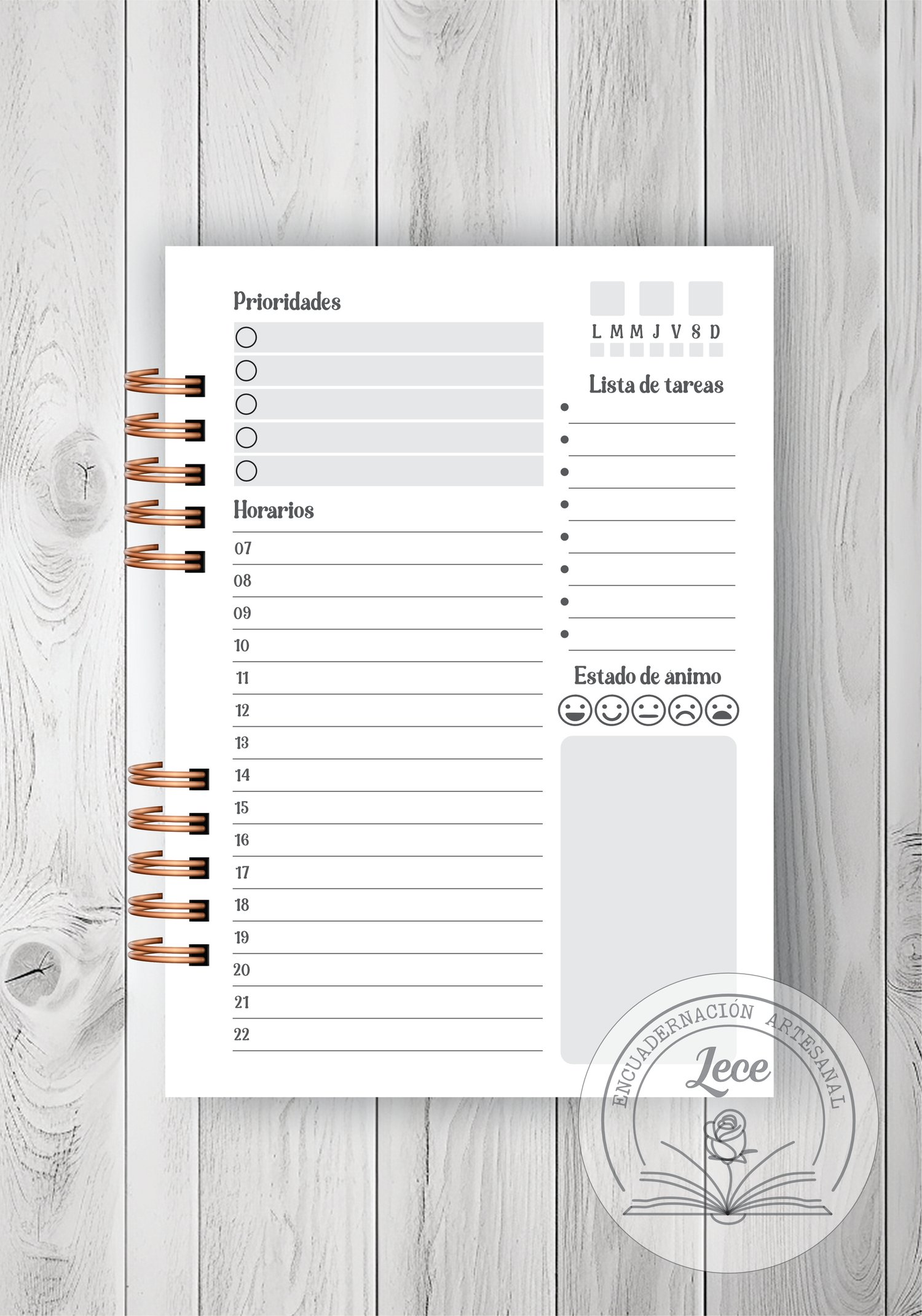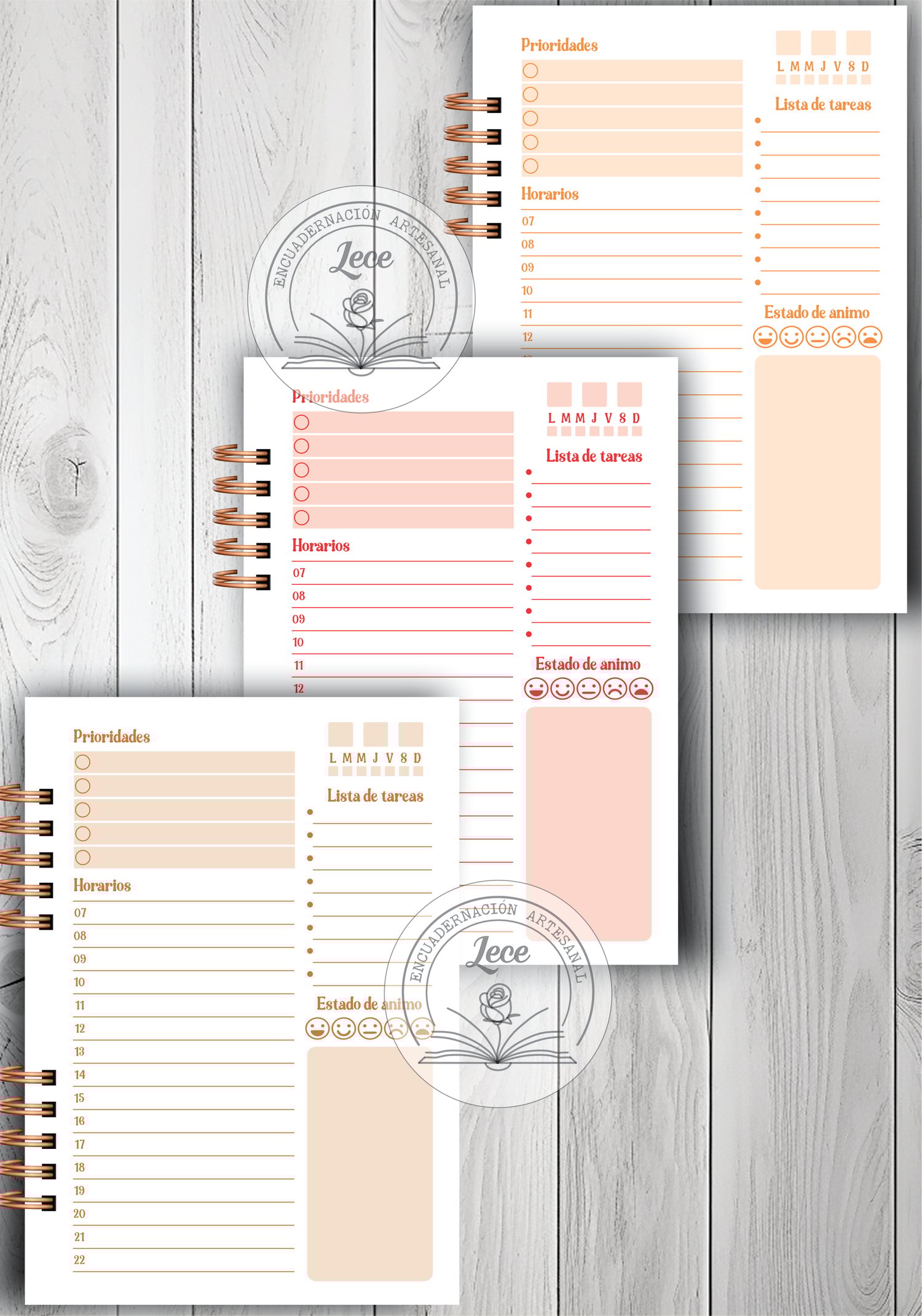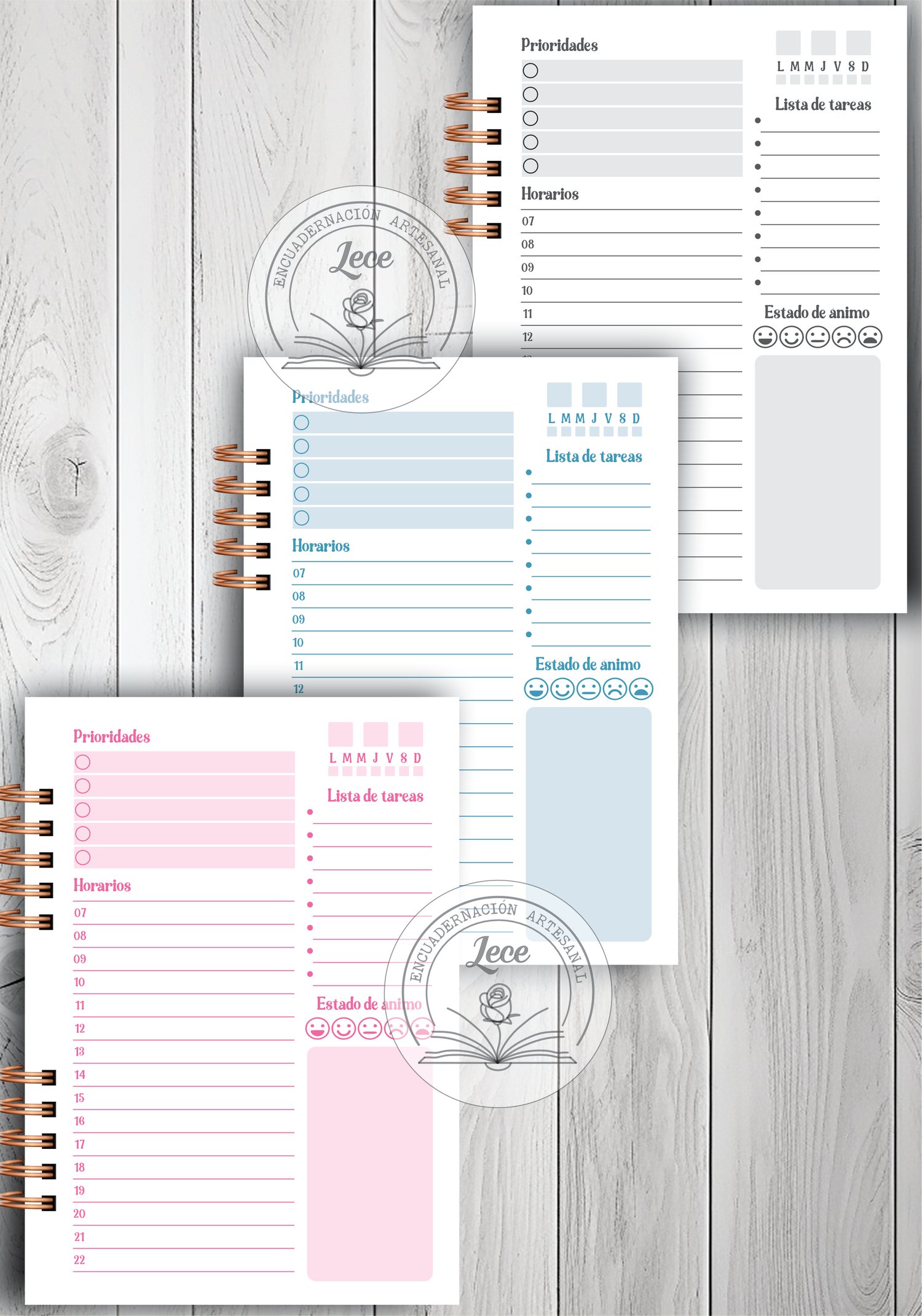 - 1 modelo de interior de planificador diario y sus variantes para imprimir en tamaño A5 para anillado, costura y para block!