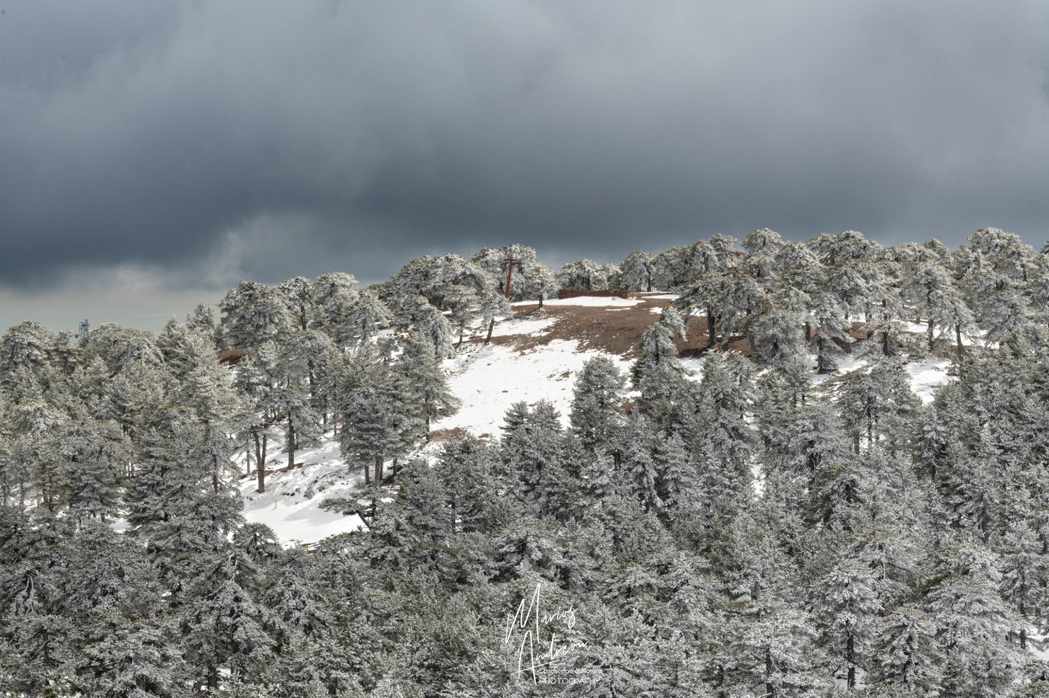 A dramatic moment unfolds over the snowy peaks of Chionistra (Troodos peak), where a blanket of pristine snow-covered trees stands in stark relief against a brooding, stormy sky. This photograph captures the raw power and breathtaking beauty of nature in the Troodos Mountains. The contrast between the silent, wintery landscape and the dynamic clouds above creates a powerful, cinematic scene.