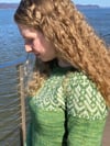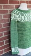 Sugar Snap is a top down, long-sleeved pullover with gentle waist shaping that leads to a slight A-line silhouette. Fair isle patterns adorn the yoke and sleeve cuffs. Instructions for the fair isle patterns are both written and charted. Additionally, at the end of this pattern I have included additional yoke and sleeve charts with inverted color schemes and no colors (so that you may color in the chart to match the yarn you’ve chosen). Short rows are used to shape the neckline after the fair isle yoke pattern is completed.