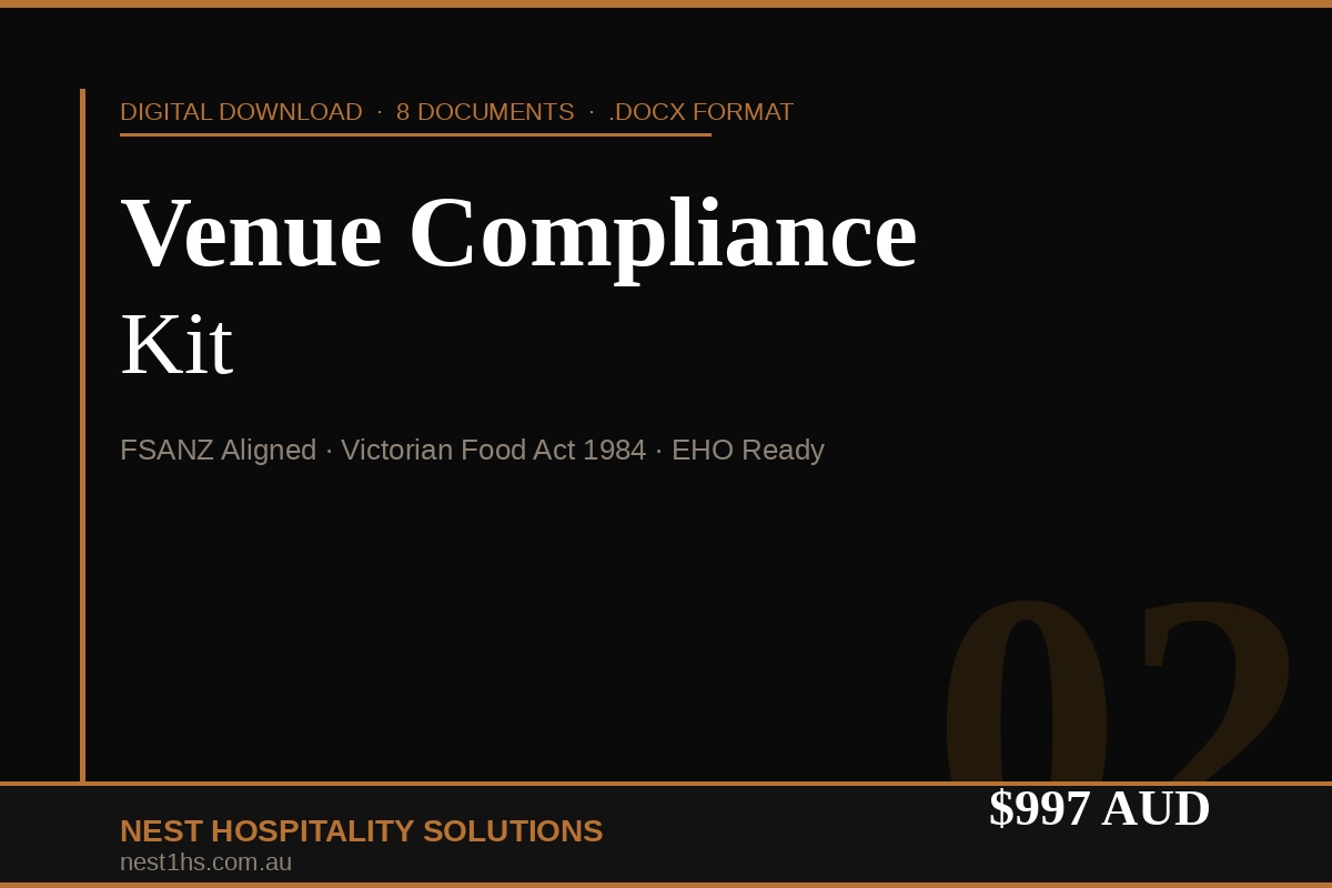 Complete compliance documentation system for Australian hospitality venues. 8 professional templates aligned to FSANZ Food Safety Standards and the Victorian Food Act 1984. Ready to implement — no consultant required.