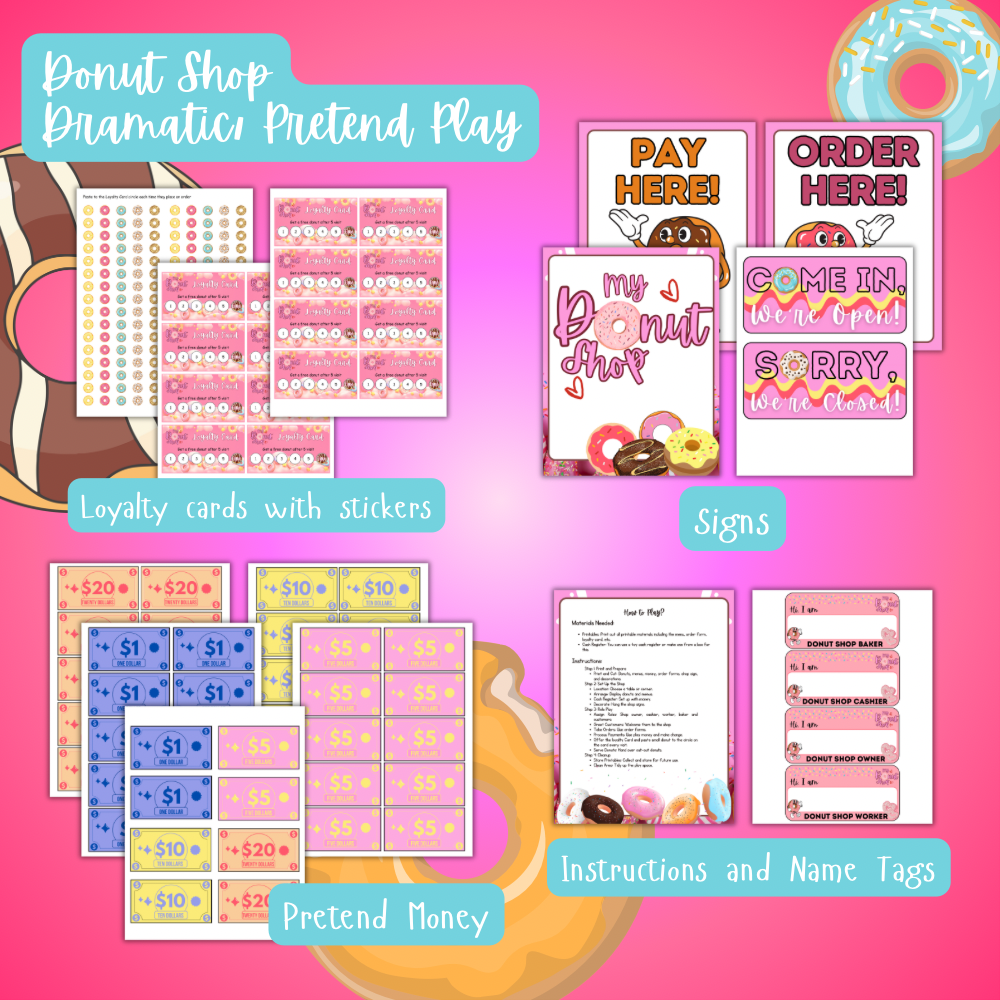 This printable pack includes everything they need to run a sweet little donut biz β menus, signs, play money, order forms, open/closed signs, and more.