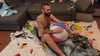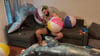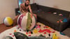 He destroy 3 intex 24" beach balloons, 1 intex 36" beach balloon, 1 intex dolphin and 1 intex realistic whale; all only whith his hands.