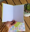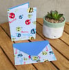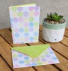 This charming set features three handmade cards (4x5 inches), each showcasing a distinct pattern with coordinating envelopes (5x6 inches). The designs include a bumblebee and ladybug pattern on a blue background, a floral mix of green, yellow, and pink on a soft green backdrop, and pastel dots in a playful mix of green, blue, pink, yellow, and purple.