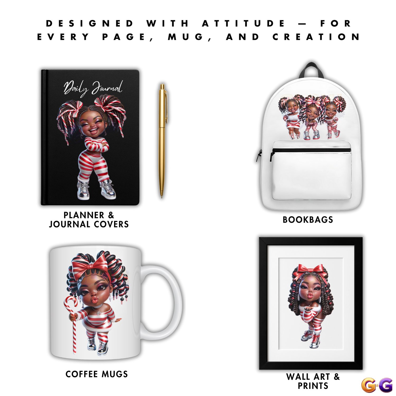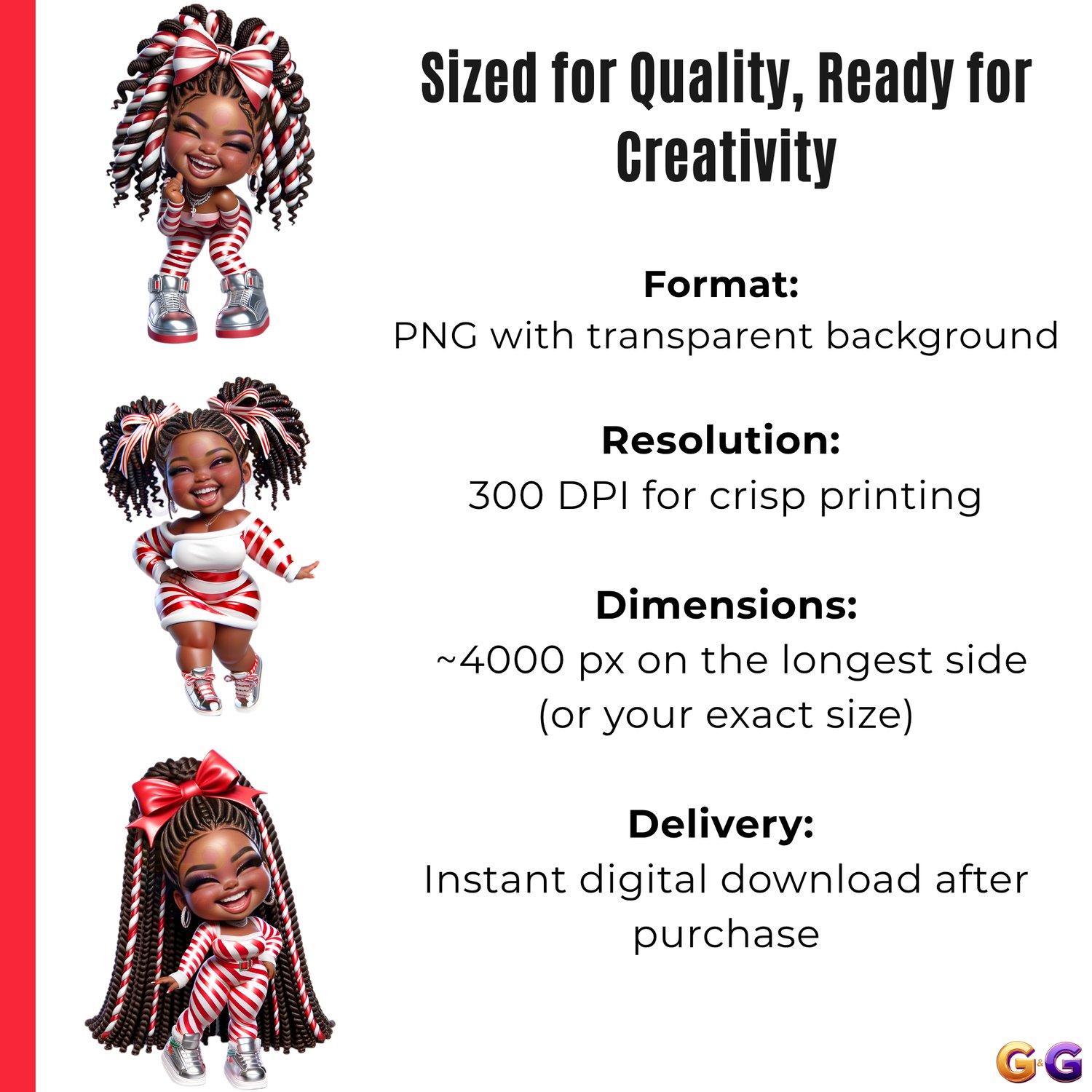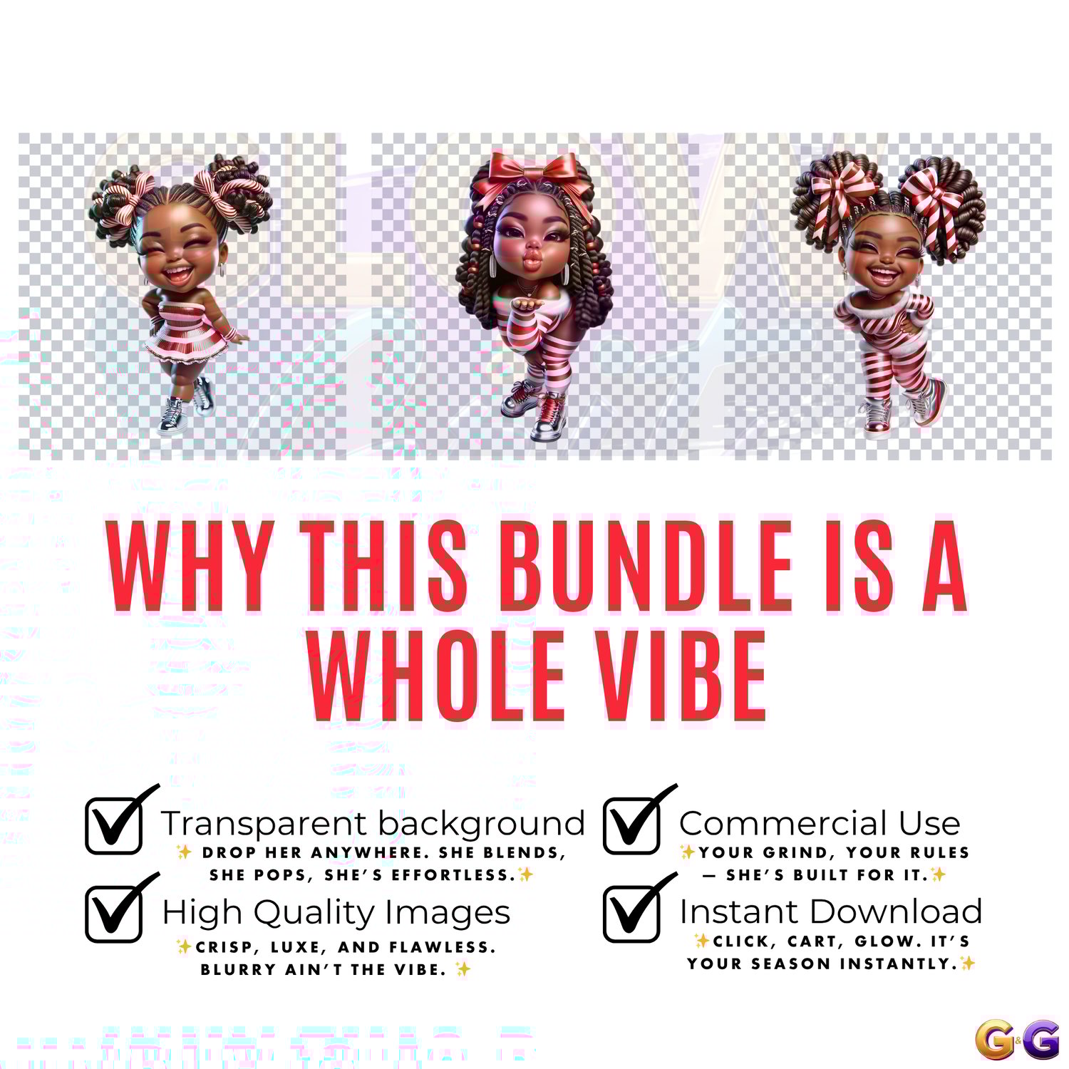 Sweet, stylish, and full of confidence. Candy Cane Cutiez brings the joy of the season to your designs with vibrant energy, cozy fashion, and unapologetic Black girl magic. Whether you’re creating digital planners or holiday merch that pops, this set delivers every ounce of festive flair.