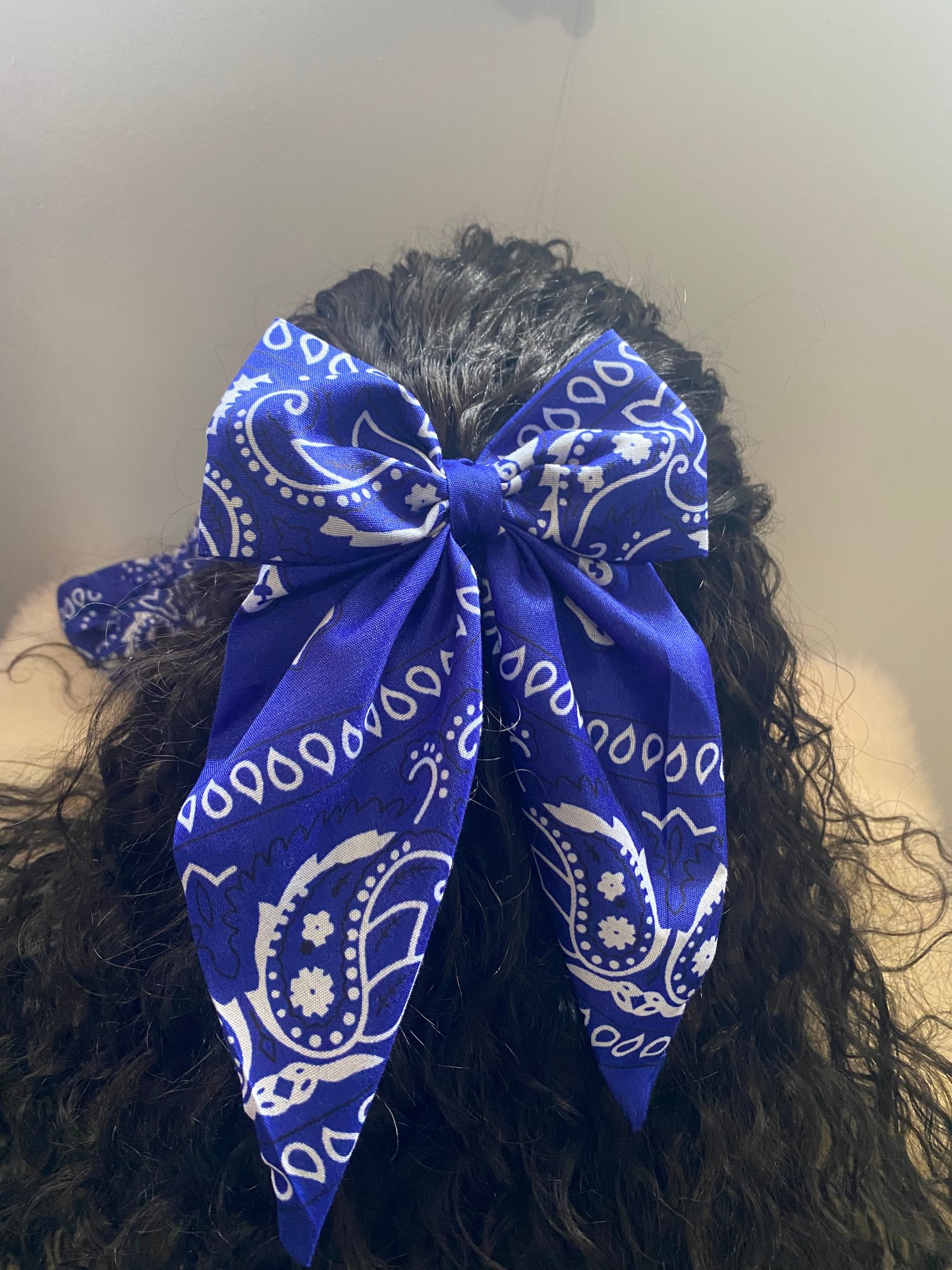 Turn heads with this bold and beautiful Big Blue Bandana Hair Bow Scrunchie, a perfect blend of street style edge and feminine charm. Crafted from vibrant indigo bandana-print fabric, this oversized bow adds instant flair to ponytails, buns, or wristwear.
