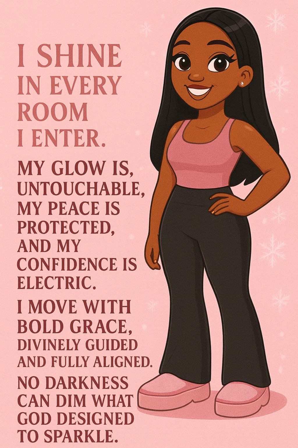 A powerful Glow Tribe affirmation for confidence, inner peace, and soft-girl self-worth. Glow Vee reminds you that your glow is protected, your presence is divine, and nothing can dim what God designed to shine. Save this for your daily mindset reset or affirmation board!