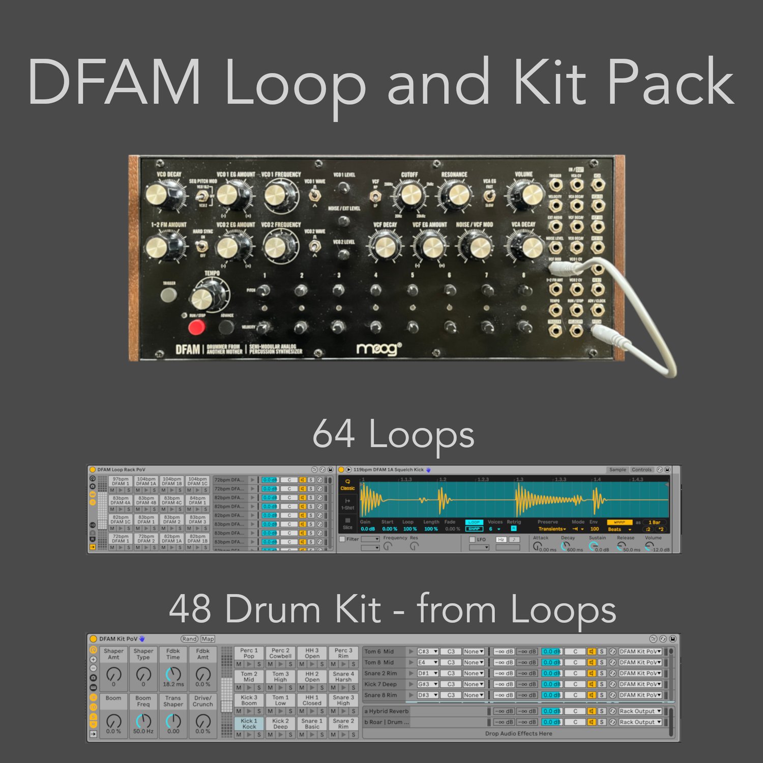 I sampled 64 loops direct from my DFAM. They vary in length, speed, and style. Some are variations of each other in either sound or added steps. From those loops I edited 48 hits to build a drum rack with standard one shot kick/bass/tom/hh type sounds. Latest version of Ableton Suite 12.1 required to use the Drum Racks. Raw audio files are provided to use in any DAW. The video goes into much more detail: https://youtu.be/isAKaKcuTbM