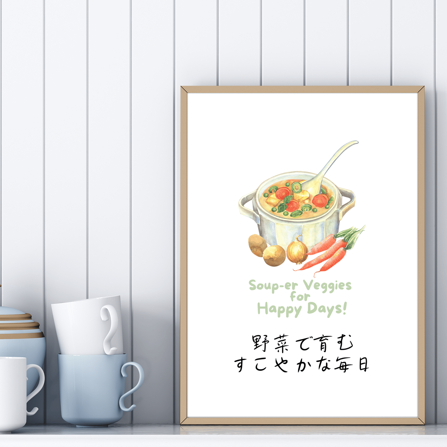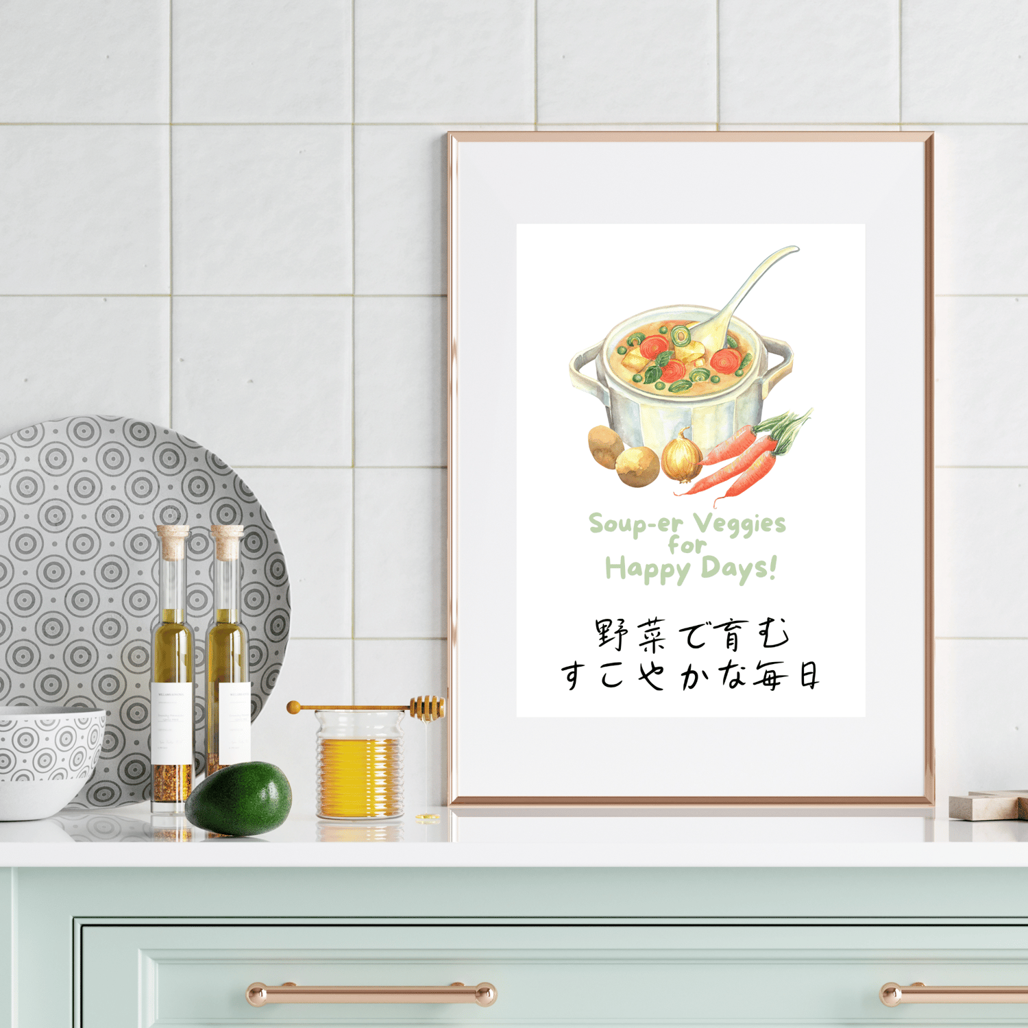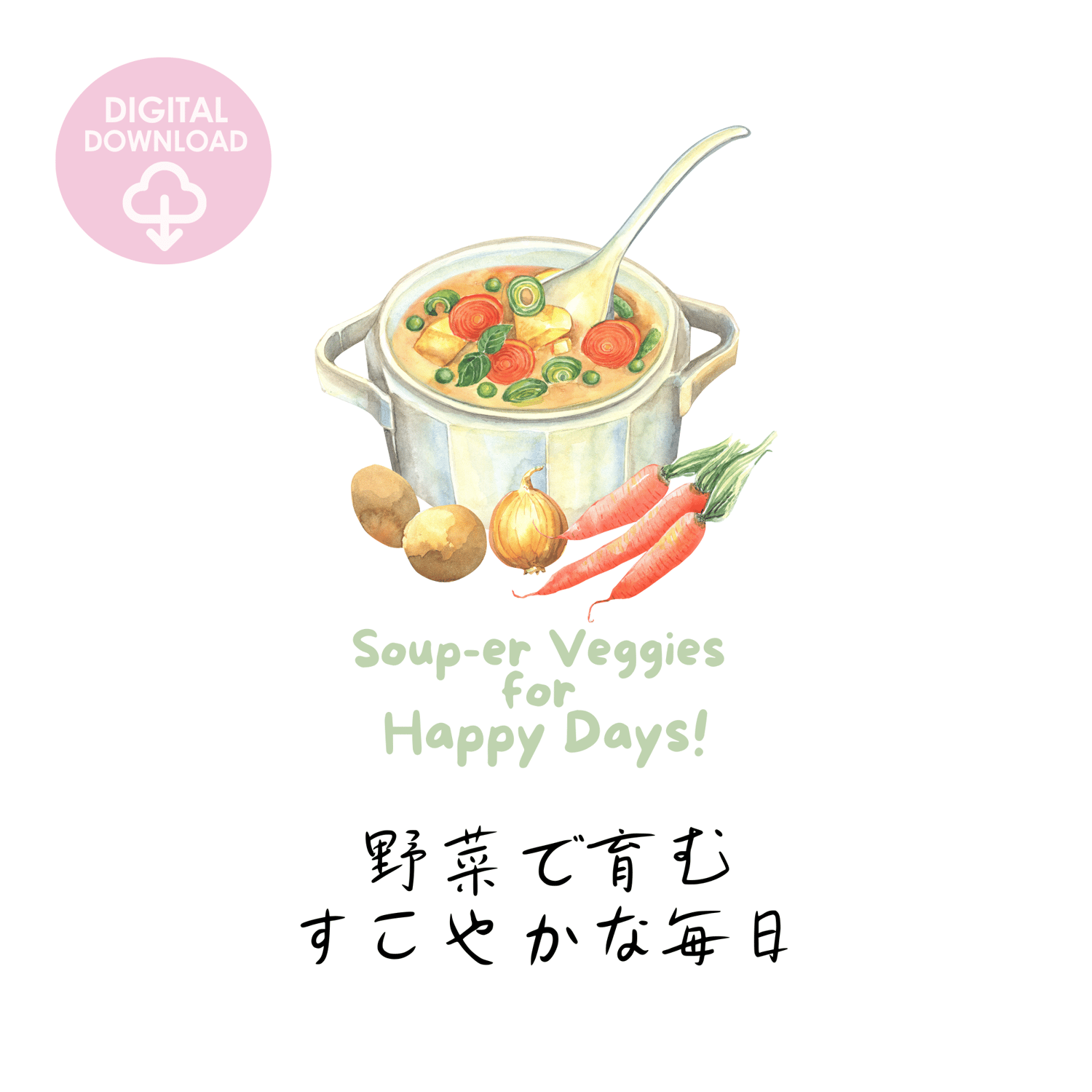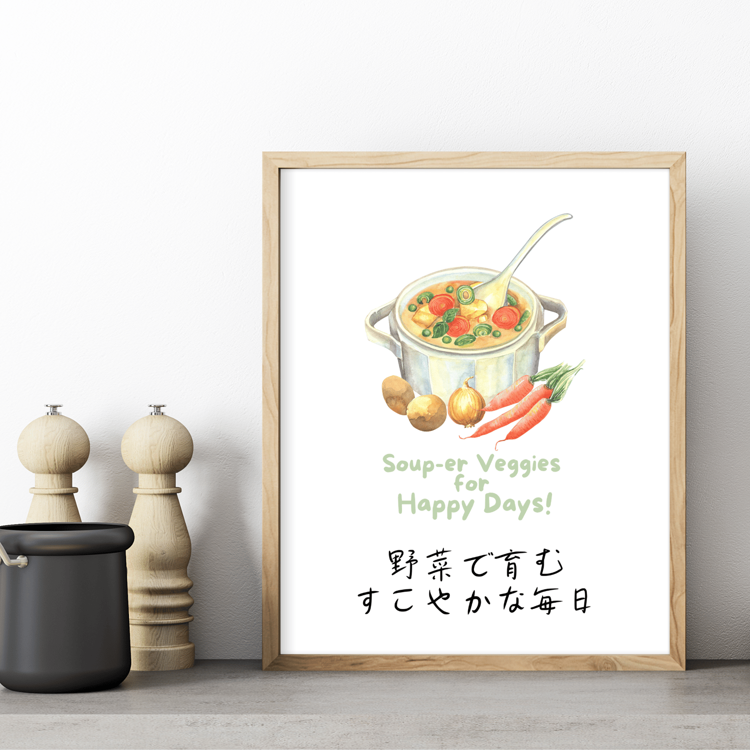 Looking to add some charm to your kitchen? This digital printable wall art features a delightful watercolor of a vegetable-filled pot of soup, perfectly paired with a witty vegetable pun. The unique Japanese typography adds an extra layer of charm and sophistication. It’s perfect for anyone who loves a dash of humor and a lot of veggies in their life!
