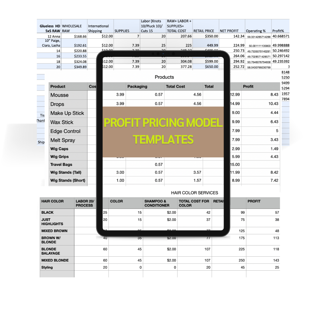 Whether you're a seasoned wig artisan or just starting in the industry, our Precision Pricing Tables are the secret to pricing your wigs for profit with ease and accuracy. Elevate your wig-making business to new heights and create financial security while continuing to pursue your passion. Get started today and unlock the true potential of your wig-making artistry!