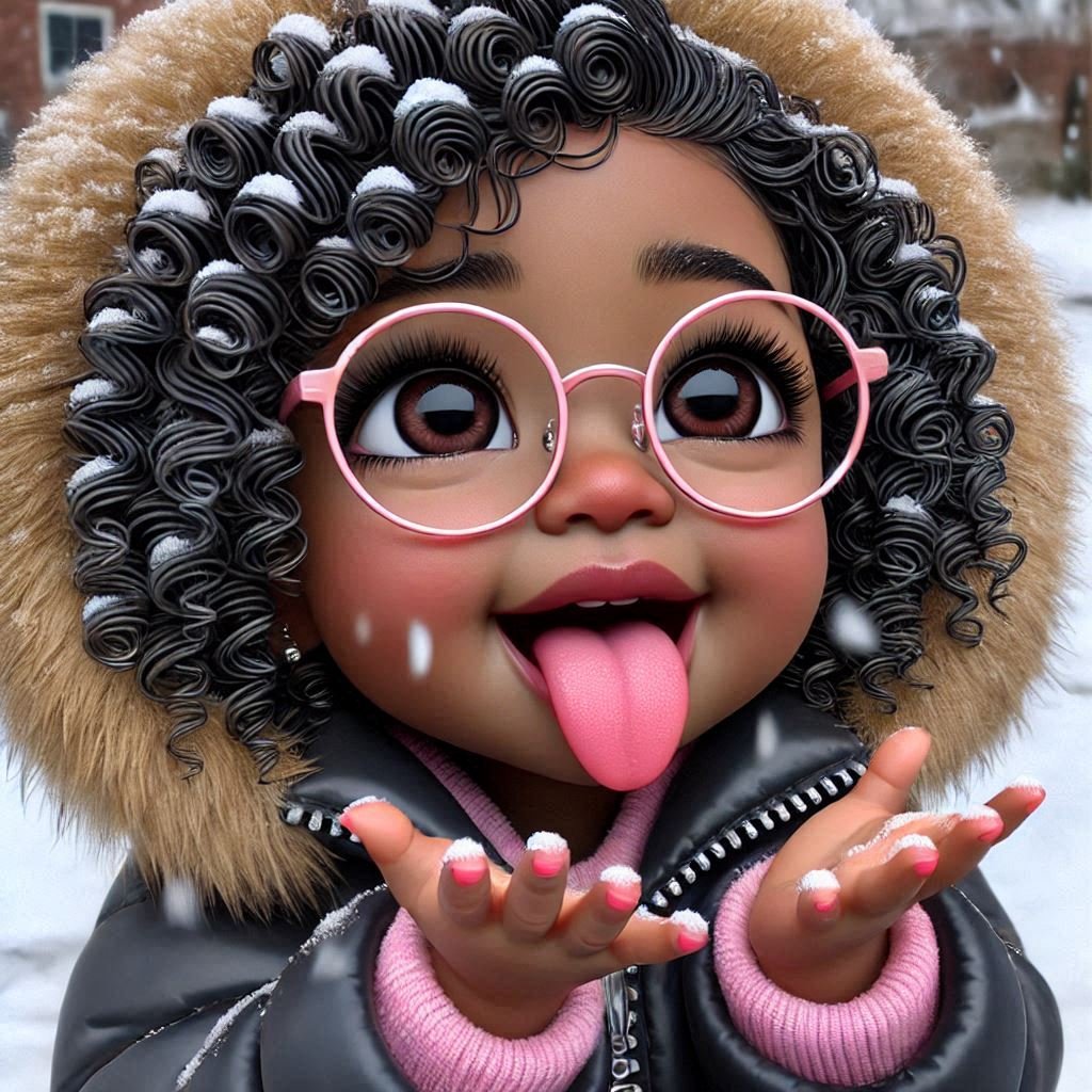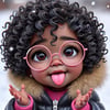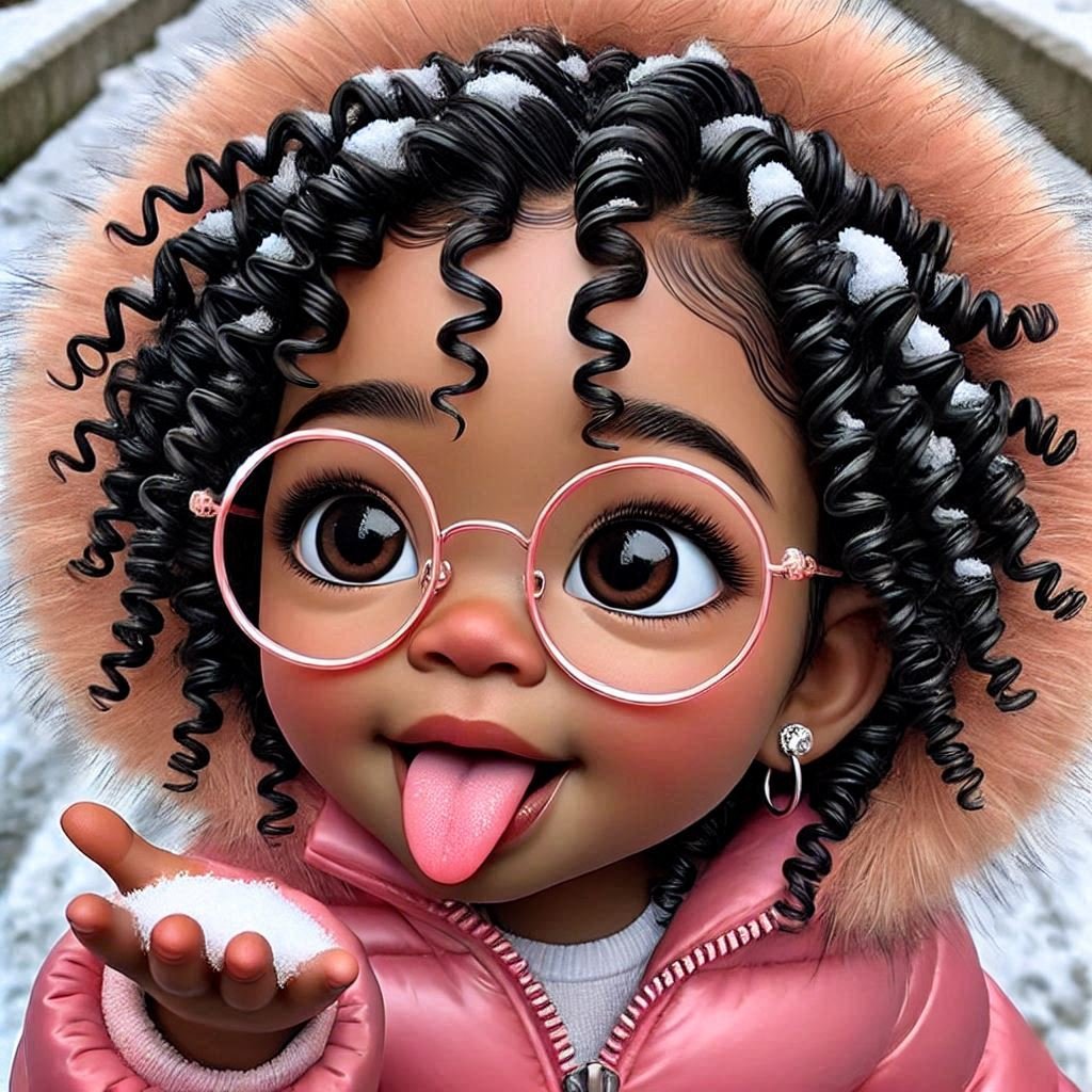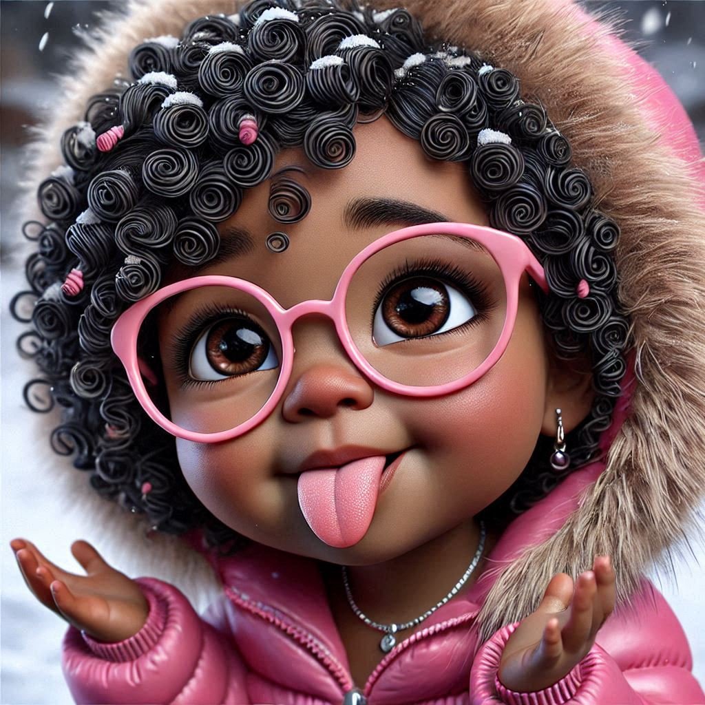 This image is a vibrant, stylized digital illustration of a young girl with big, expressive eyes and a joyful expression. Her glossy black curls, adorned with snowflakes, frame her face and add texture to her look. She is wearing round pink glasses, a pink fur-lined hooded jacket, and small hoop earrings, enhancing her playful and cozy winter vibe. The girl is holding snow in her hand and playfully sticking out her tongue, capturing a lively and cheerful moment. The snowy background complements the scene, emphasizing a winter atmosphere.