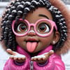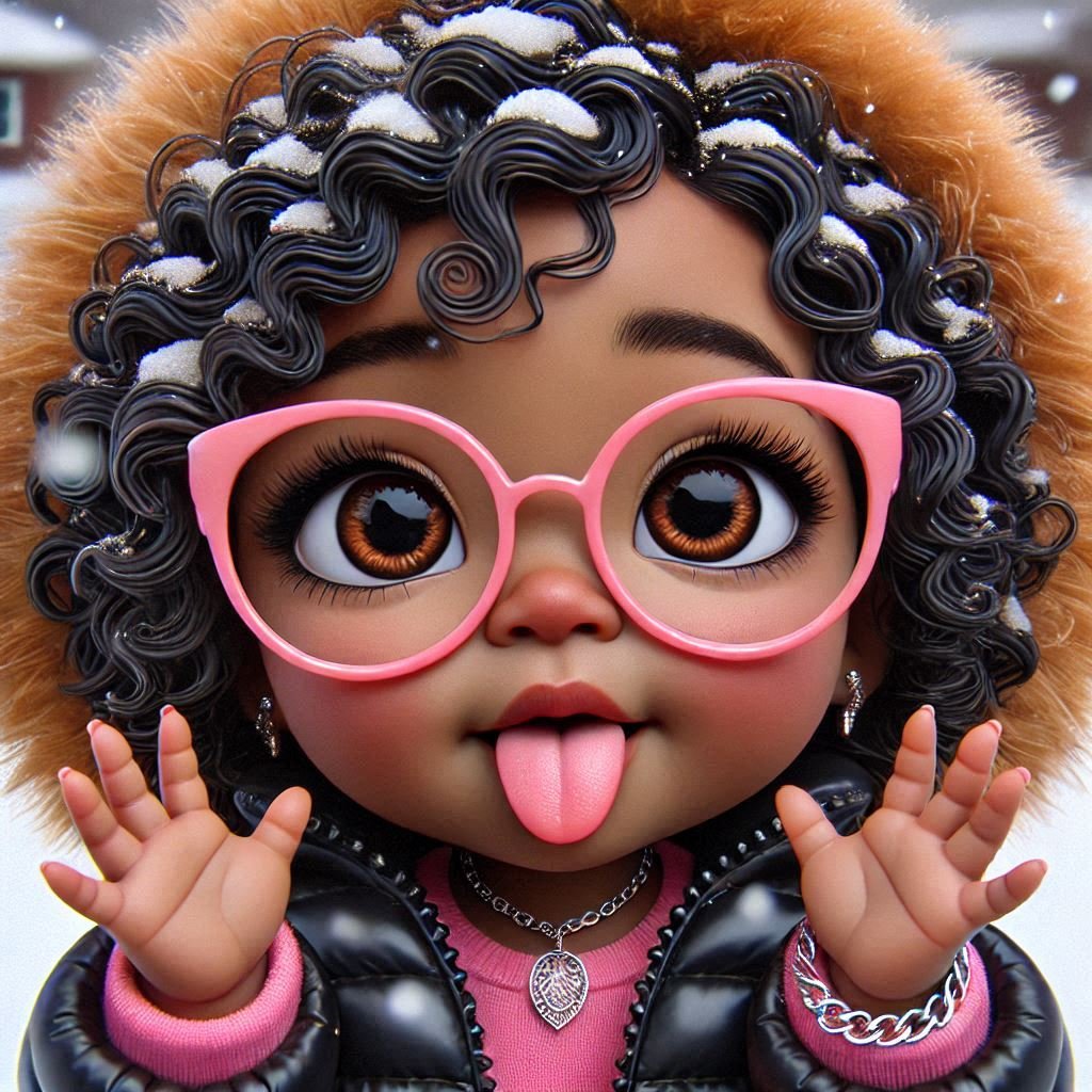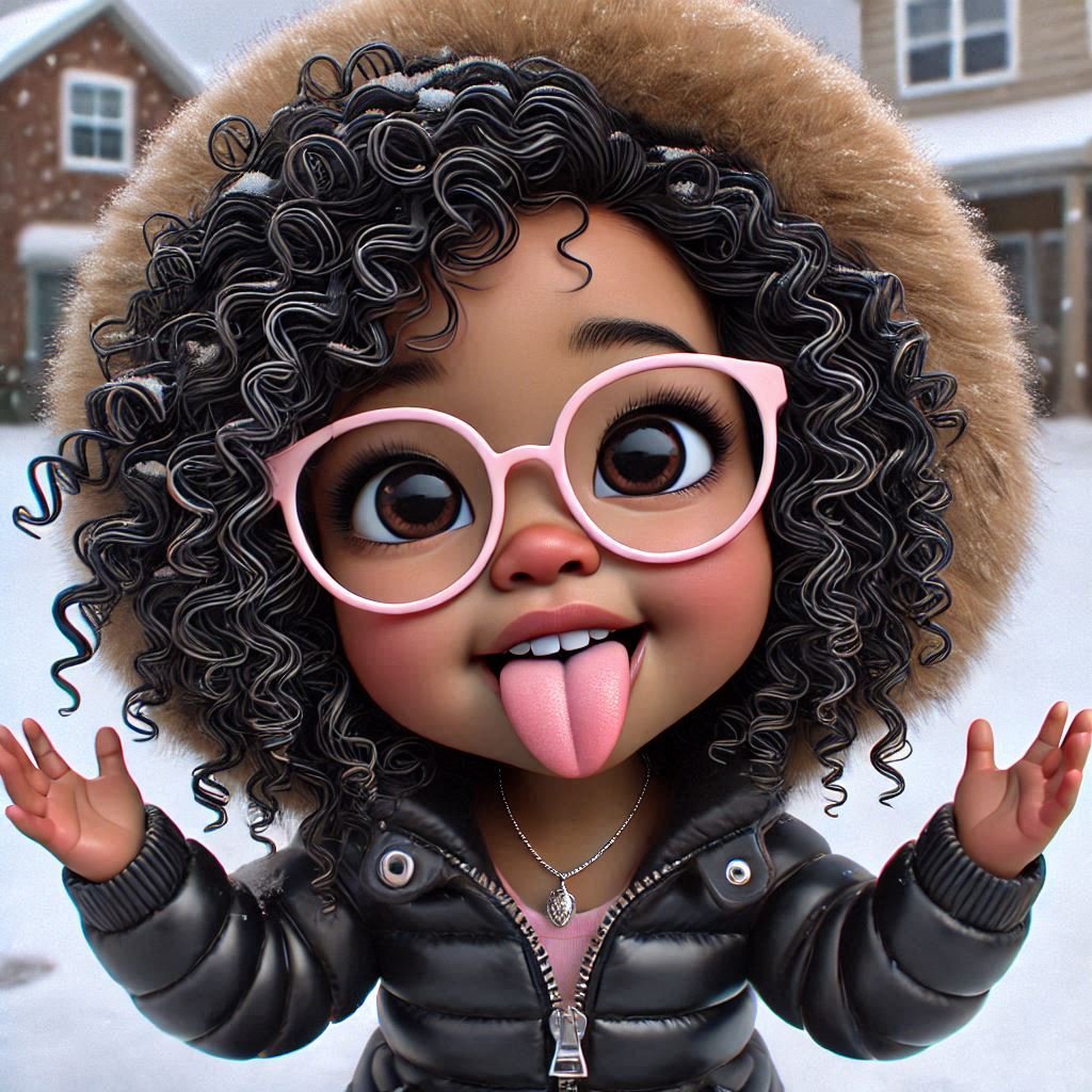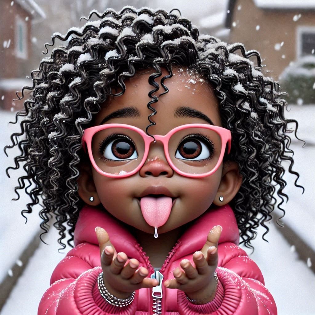 This image is a vibrant, stylized digital illustration of a young girl with big, expressive eyes and a joyful expression. Her glossy black curls, adorned with snowflakes, frame her face and add texture to her look. She is wearing round pink glasses, a pink fur-lined hooded jacket, and small hoop earrings, enhancing her playful and cozy winter vibe. The girl is holding snow in her hand and playfully sticking out her tongue, capturing a lively and cheerful moment. The snowy background complements the scene, emphasizing a winter atmosphere.