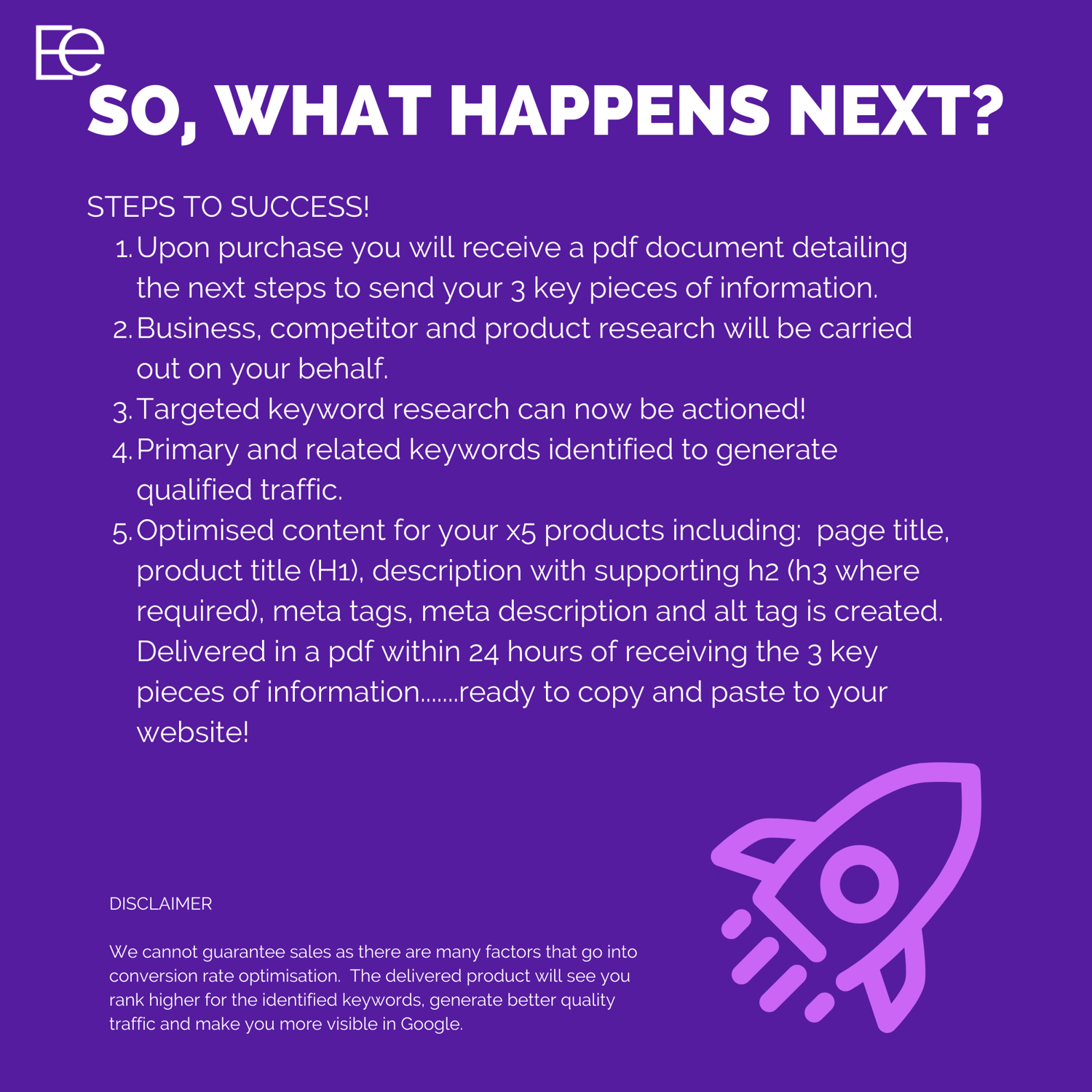 Upon purchase, you will receive a digital download detailing the next steps. To get the best results, we need just a few crucial pieces of information from you: a link to your x5 products, a short description of your target customer, and links to your top 3 competitors. Once we have received this, your product content will be delivered via a second pdf within 24 hours, ready for you to copy and paste into your website!