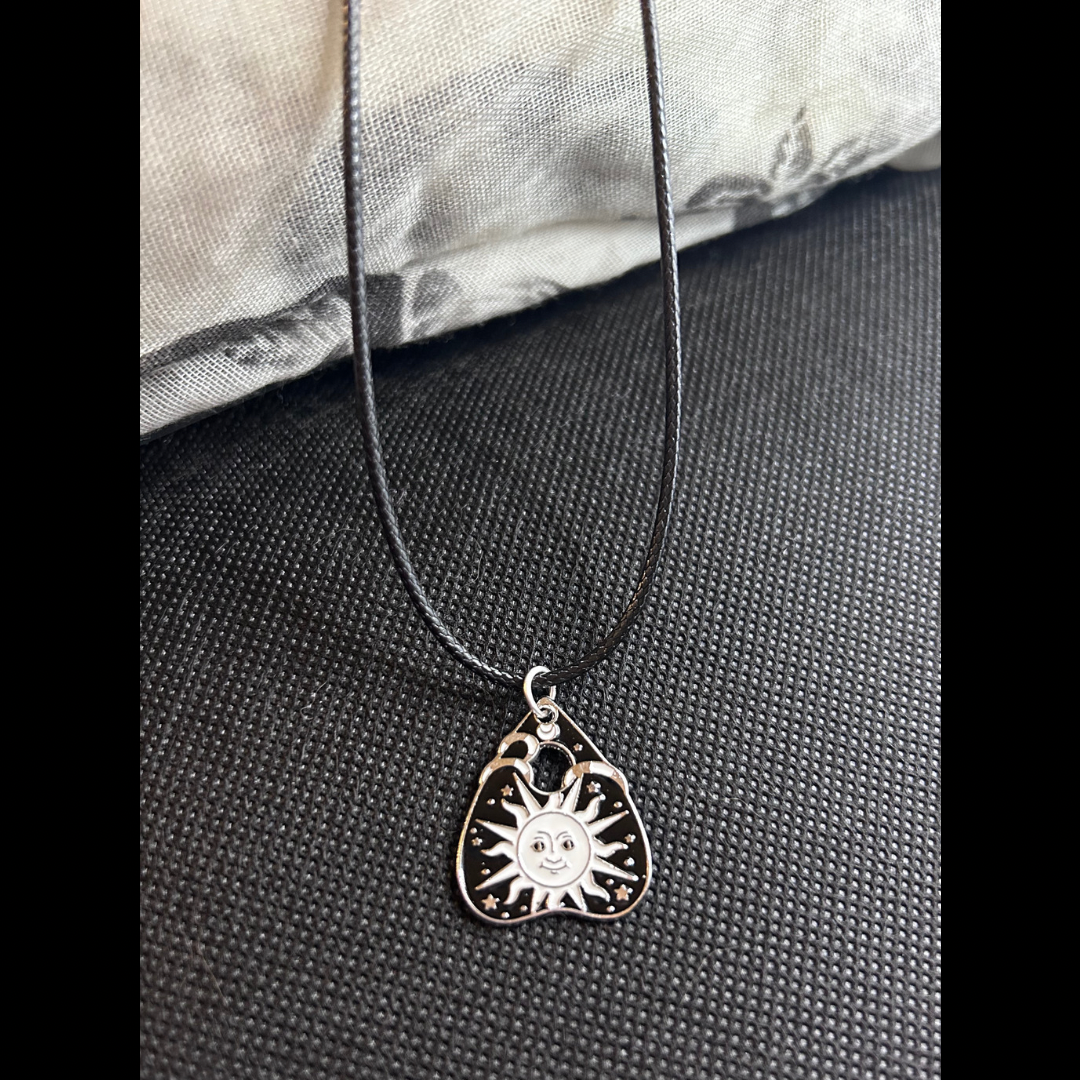 Our sun planchette necklace is a sleek and stylish accessory that features the sun in a bold silver finish. It can be worn as a statement piece to show off your personality, or as a subtle nod to your zodiac sign. The the white and black add a trendy touch to any outfit and makes it a versatile accessory to have in your jewelry collection.
