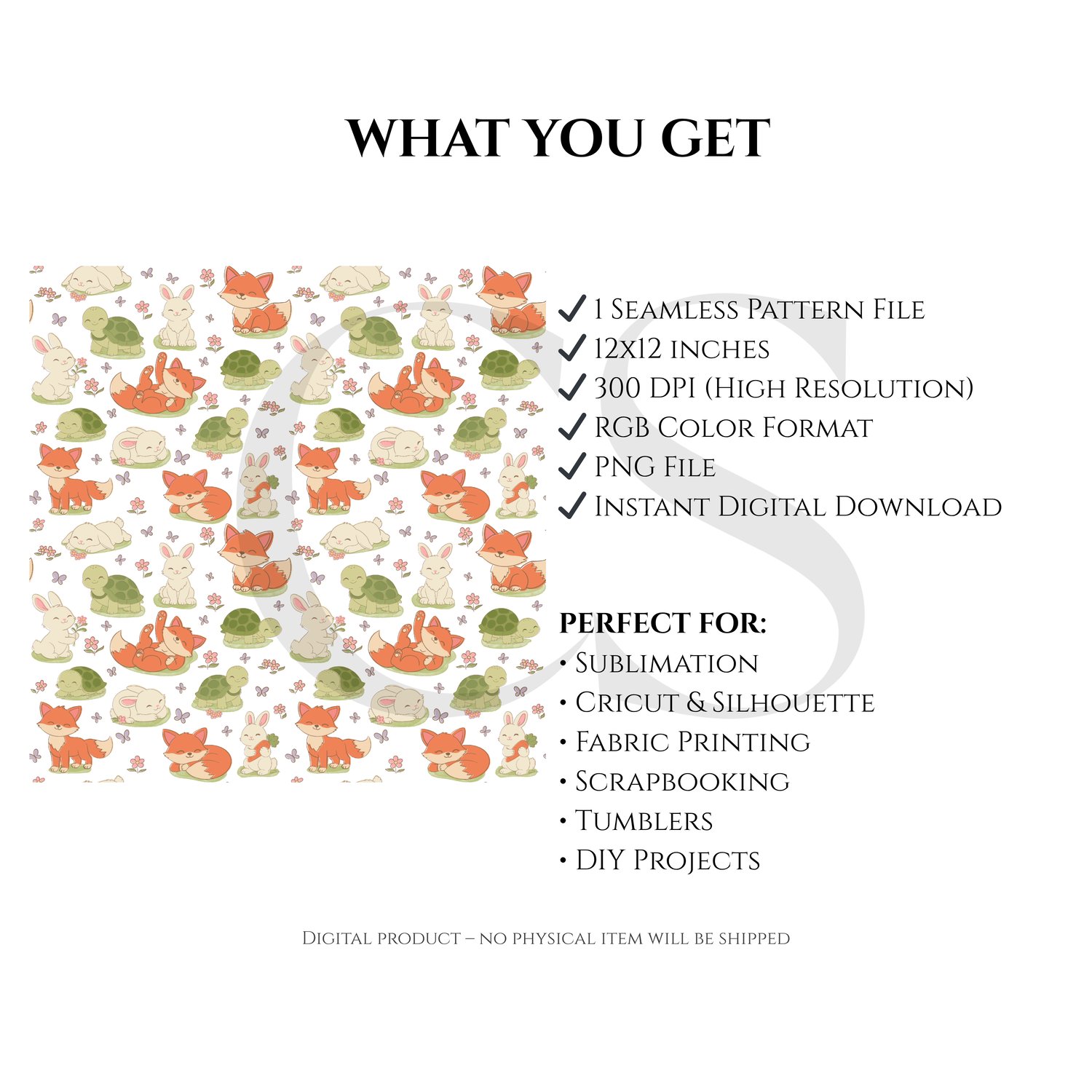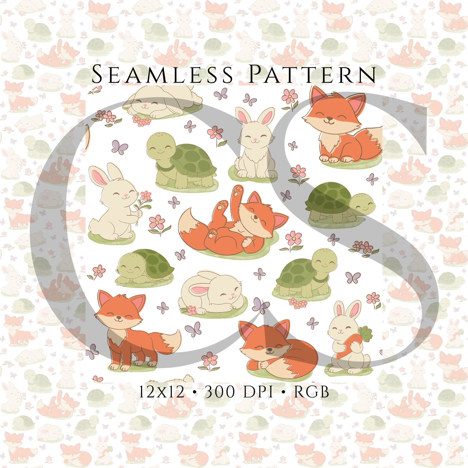 This adorable seamless pattern features a whimsical collection of woodland friends including playful foxes, sweet bunnies, and cheerful turtles surrounded by delicate flowers and butterflies. Designed in a soft storybook illustration style, this pattern is perfect for nursery decor, baby clothing, children’s fabrics, and cozy craft projects.